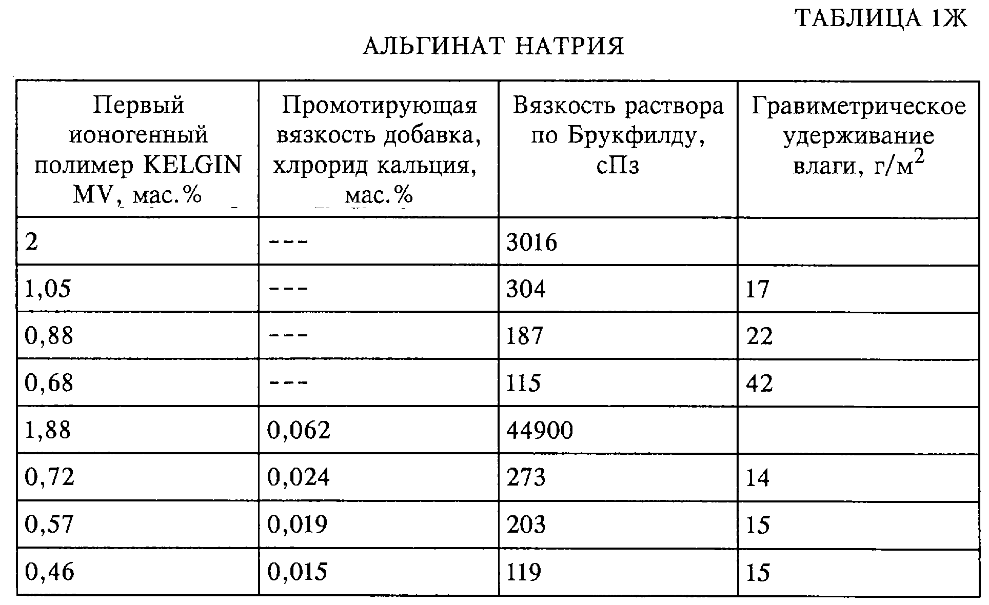В табл.1Ж первым ионогенным полимером является альгинат натрия (продукт KELGIN MV; фирма Keico, Сан-Диего), а промотирующей вязкость добавкой служит хлорид кальция.