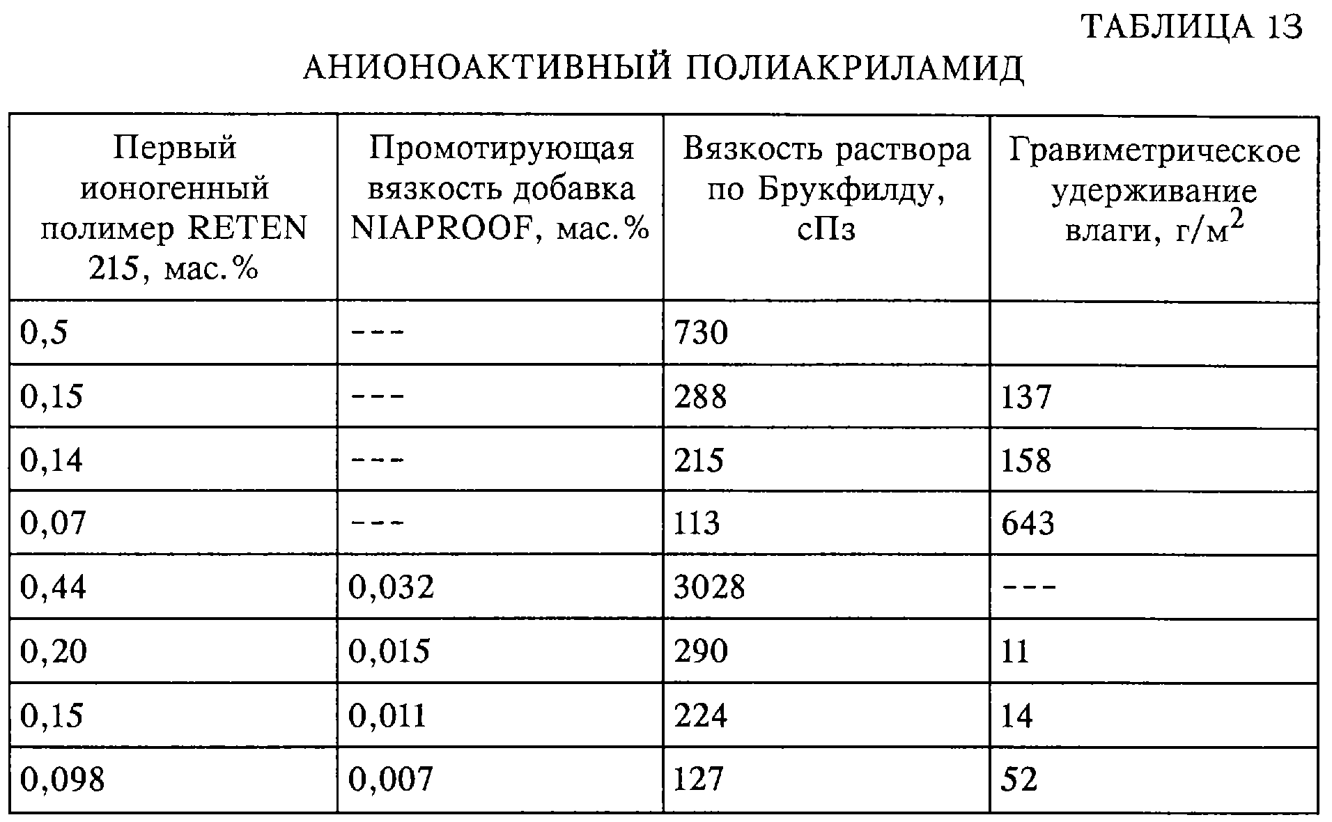 В табл.1З первым ионогенным полимером является анионоактивный полиакриламид (продукт RETEN 215; фирма Hercules Incorporated, Уилмингтон, шт. Делавэр), а промотирующей вязкость добавкой служит основный ацетат алюминия (продукт NIAPROOF; фирма Union Carbide, Нью-Йорк, шт. Нью-Йорк).