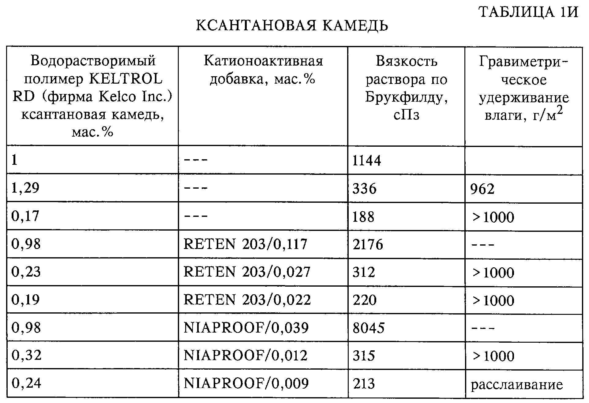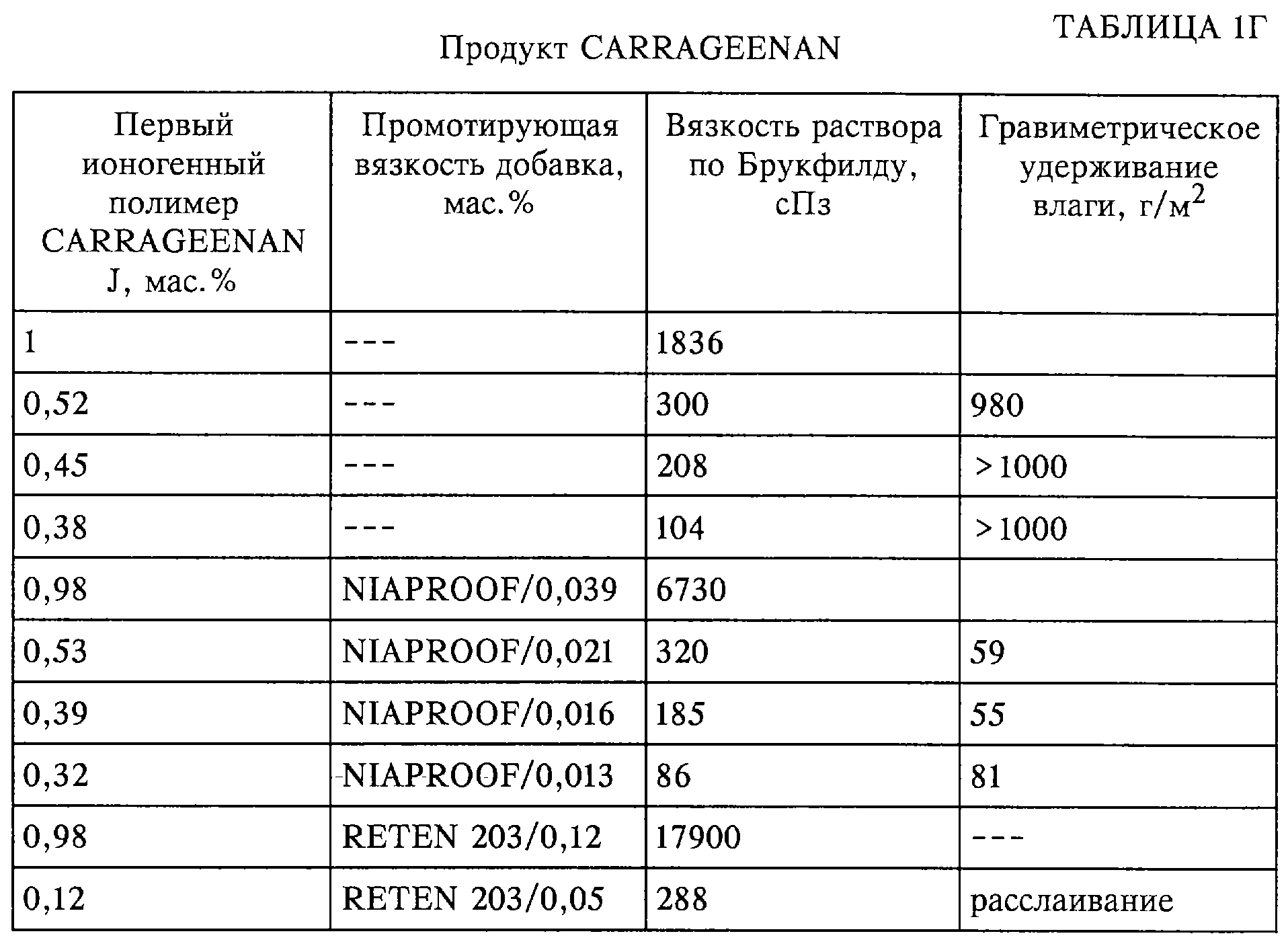 В табл.1Г первым ионогенным полимером является анионоактивный каррагенан (продукт CARRAGEENAN J; фирма Hercules Incorporated, Уилмингтон, шт. Делавэр), а промотирующей вязкость добавкой служит основный ацетат алюминия (продукт NIAPROOF, полученный на фирме Union Carbide, Нью-Йорк, шт. Нью-Йорк) или разбавленный катионоактивный полиДАДМАХ (продукт RETEN 203; фирма Hercules Incorporated, Уилмингтон, шт. Делавэр).