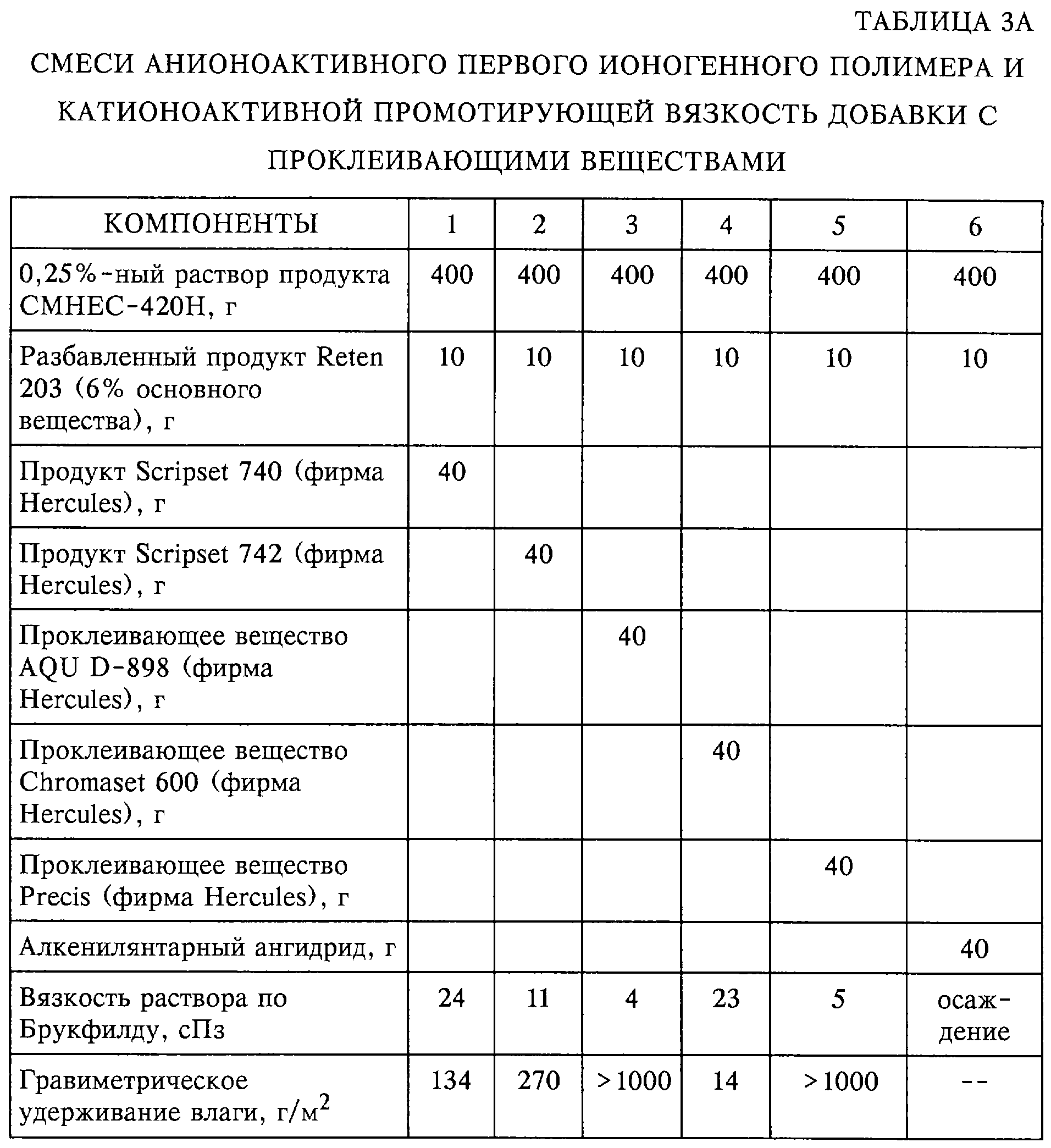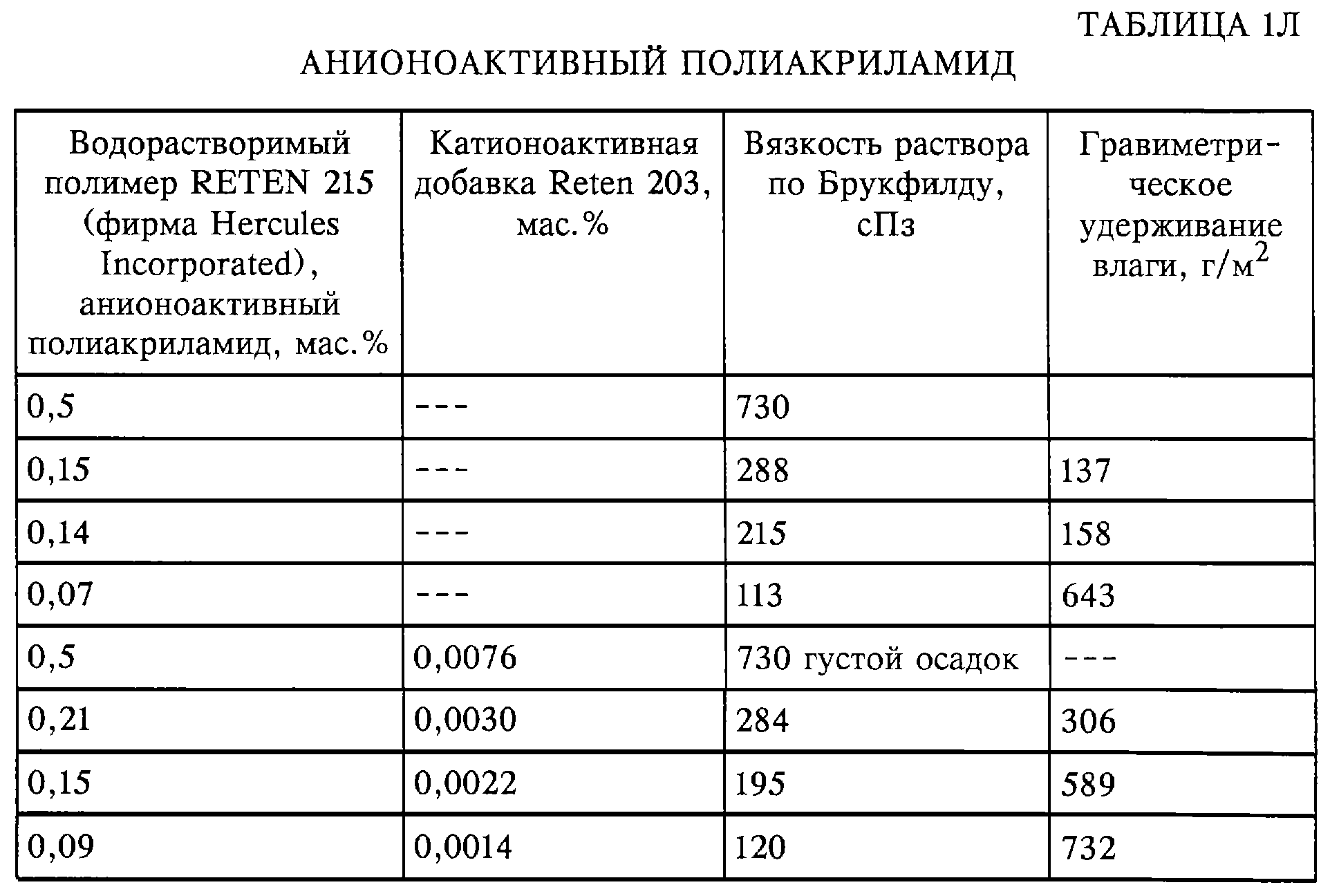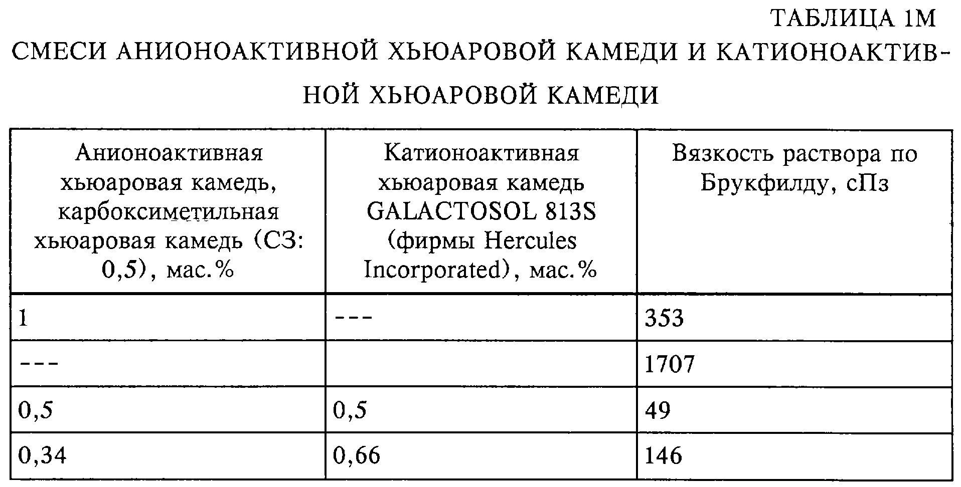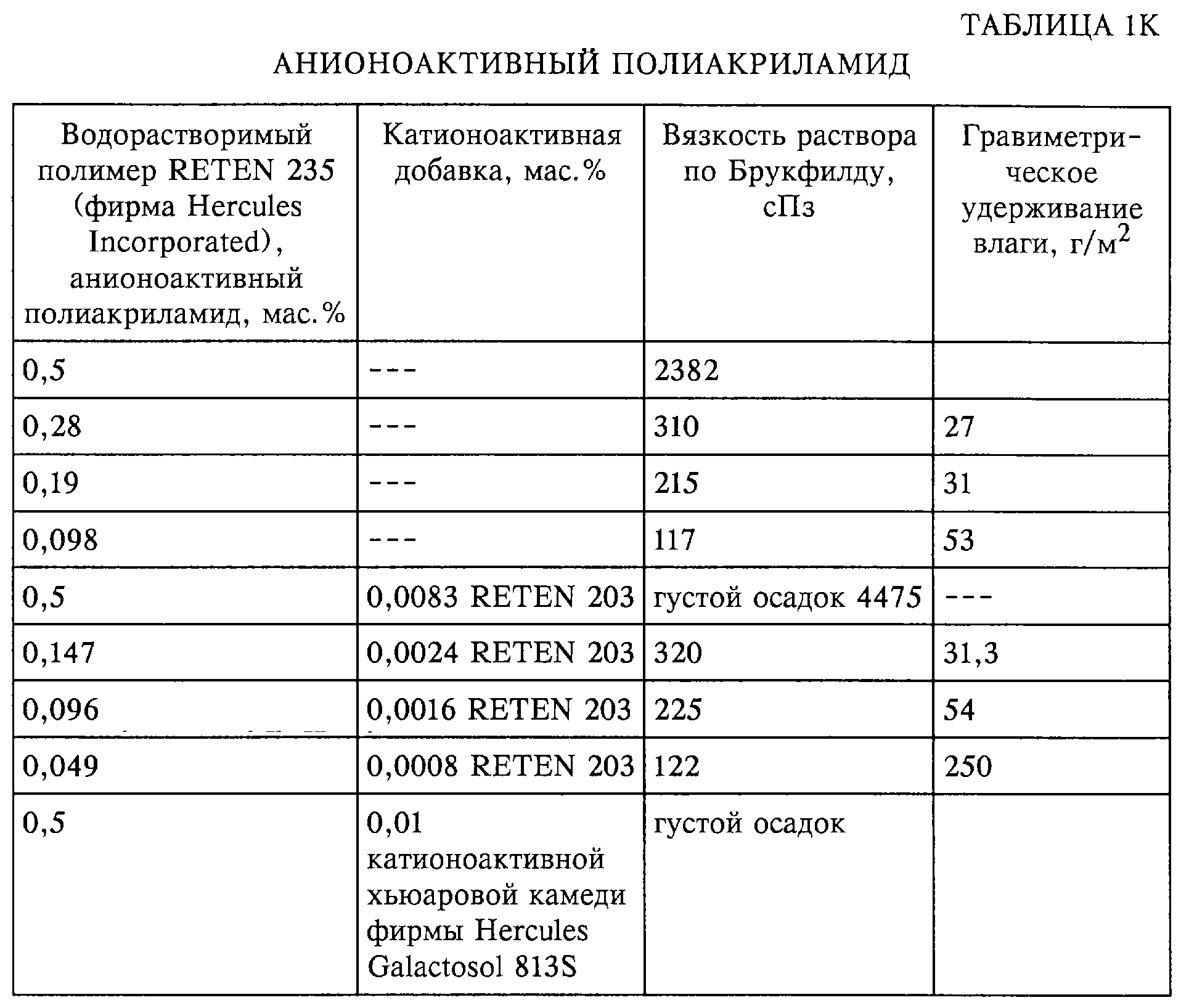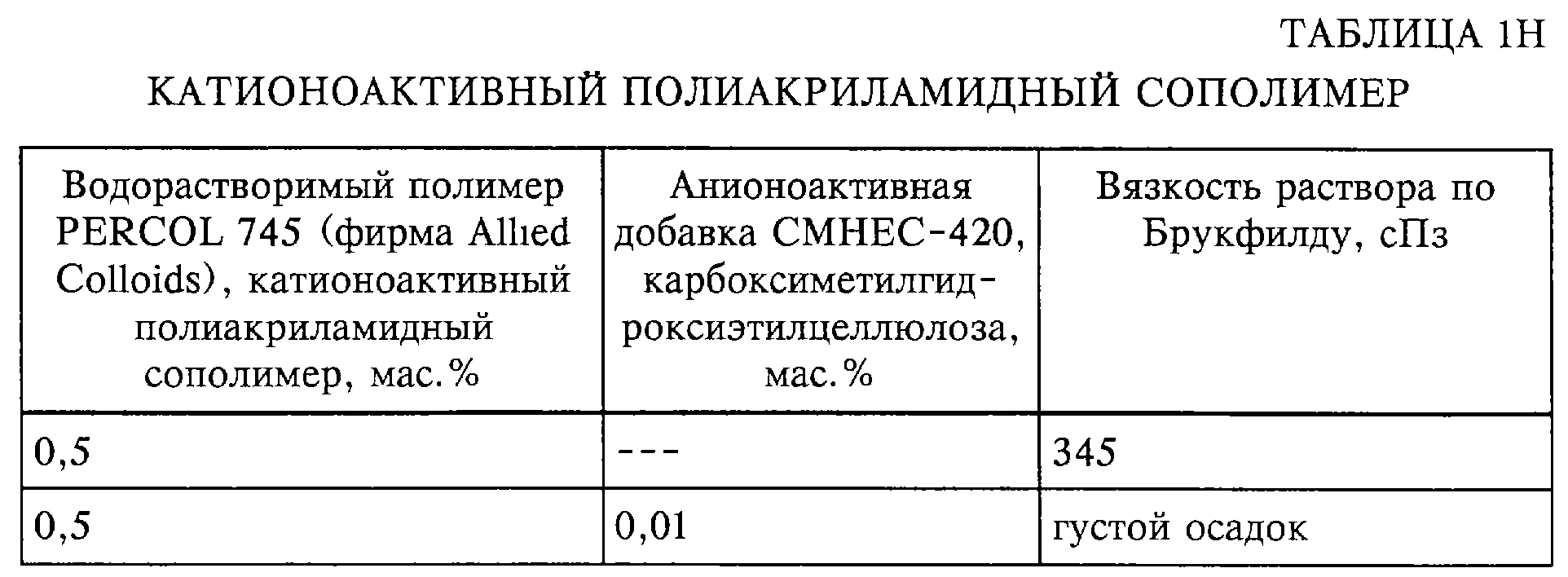 Тот факт, что анионоактивный полиакриламид не обеспечивает достижения реологического преимущества улучшенного удерживания влаги в смеси с катионоактивными добавками, может быть следствием тенденции этого полимера, когда он смешан с катионоактивными материалами, к образованию густого осадка, как это представлено в табл.1К и 1Л. Это явление показывает, что в ранее описанных смесях анионоактивных и катионоактивных полиакриламидных сополимеров, которые могут быть использованы при изготовлении бумаги, должен действовать механизм, отличный от механизма по настоящему изобретению. Если основываться на установленных фактах, то очевидно, что обсуждение применения ранее известных смесей анионоактивных и катионоактивных материалов не приводит к созданию настоящего изобретения. Более того, неудача в попытке приготовления смесей либо катионоактивных, либо анионоактивных полиакриламидных сополимеров с добавками с противоположным зарядом, которые могут быть использованы для достижения улучшенной способности удерживать влагу (табл.1К, 1Л и 1Н) или приготовления смесей катионоактивной хьюаровой камеди с анионоактивной хьюаровой камедью, которые могут быть использованы для достижения улучшенной способности удерживать влагу (табл.1М), приводит к выводу о том, что предлагаемые по настоящему изобретению эффективные сочетания компонентов с противоположными зарядами, обеспечивающие достижение улучшенной способности удерживать влагу, учитывая прежний опыт использования в данной области техники этих конкретных полимеров, не очевидны.