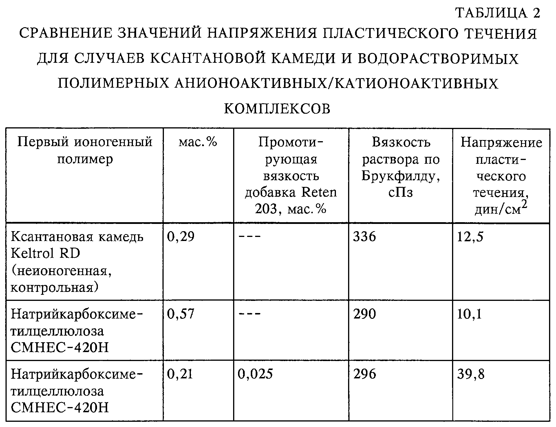Выбранные из примера 1 растворы испытывают на напряжение пластического течения при очень низкой скорости сдвига с помощью реометра Болина (Bohlin). Эти растворы включают контрольный раствор неионогенной ксантановой камеди и растворы продукта СМНЕС-420 при наличии и отсутствии катионоактивных добавок. Все испытываемые растворы готовят с доведением до постоянных значений вязкости по Брукфилду разбавлением основных растворов до достижения значений вязкости примерно 300 сПз. В ходе проведения этих испытаний установлено, что значения напряжения пластического течения раствора анионоактивного водорастворимого полимера при наличии катионоактивной добавки при данной вязкости по Брукфилду значительно выше, чем раствора только анионоактивного полимера или контрольного раствора ксантановой камеди. Эти результаты представлены в табл.2.