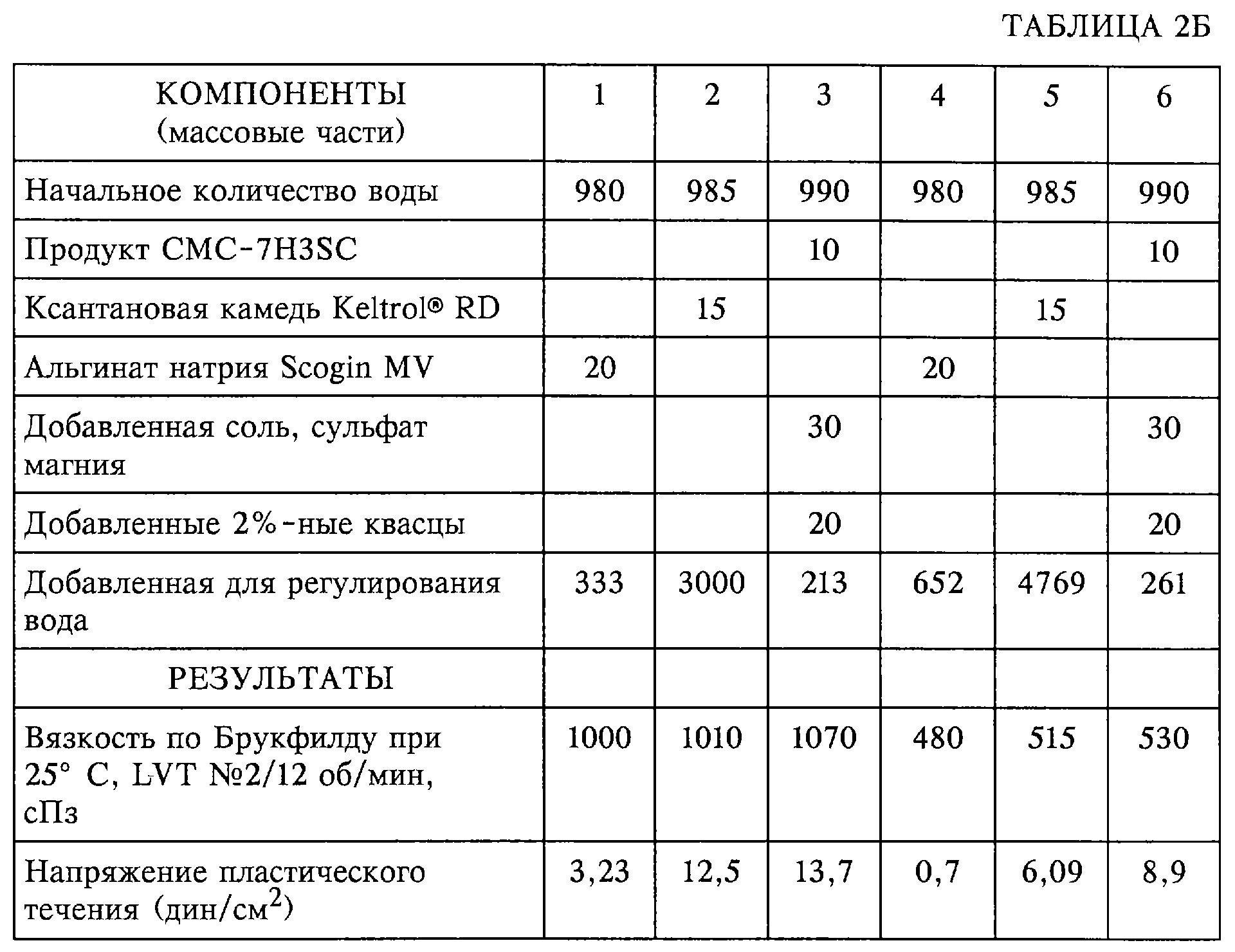 Основные растворы продукта CMC-7H3SC в комплексе с сульфатом алюминия в воде готовят введением 10 мас.ч. продукта CMC-7H3SC в 990 мас.ч. дистиллированной воды, перемешиванием для растворения в течение двух часов и добавлением 30 мас.ч. сульфата магния, а затем 20 мас.ч. 18-гидратного 2%-ного сульфата алюминия. Отмечают образование неустойчивого геля. Концентрацию аликвот основного раствора регулируют добавлением дополнительного количества воды, как показано в табл.2Б, с достижением значений вязкости по Брукфилду либо примерно 1000 сП (LVT №2/12 об/мин), либо примерно 500 сП.