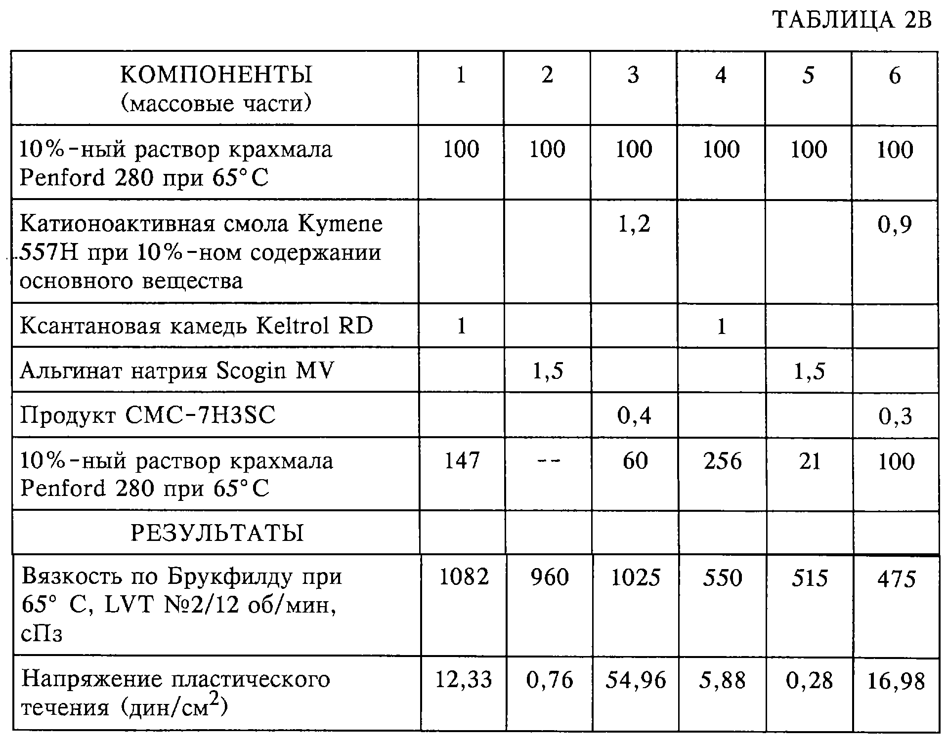 Растворы трех модификаторов реологии в водном крахмальном растворе готовят вначале варкой и растворением 10%-ного раствора этилированного крахмала Penford 280 в дистиллрованной воде, затем растворением в нем различных камедей и компонентов, представленных в табл.2В. После этого вязкость таких растворов регулируют с достижением целевых значений примерно 500 и 1000 сП добавлением дополнительных аликвот 10%-ного раствора крахмала Penford 280, что позволяет довести концентрацию камедей до уровня, при котором обеспечивалась бы целевая вязкость.