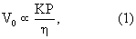 где V0 обозначает скорость поглощения раствора пористой подложкой, К обозначает проницаемость поверхности, Р является членом уравнения, использованным для обозначения давления, а