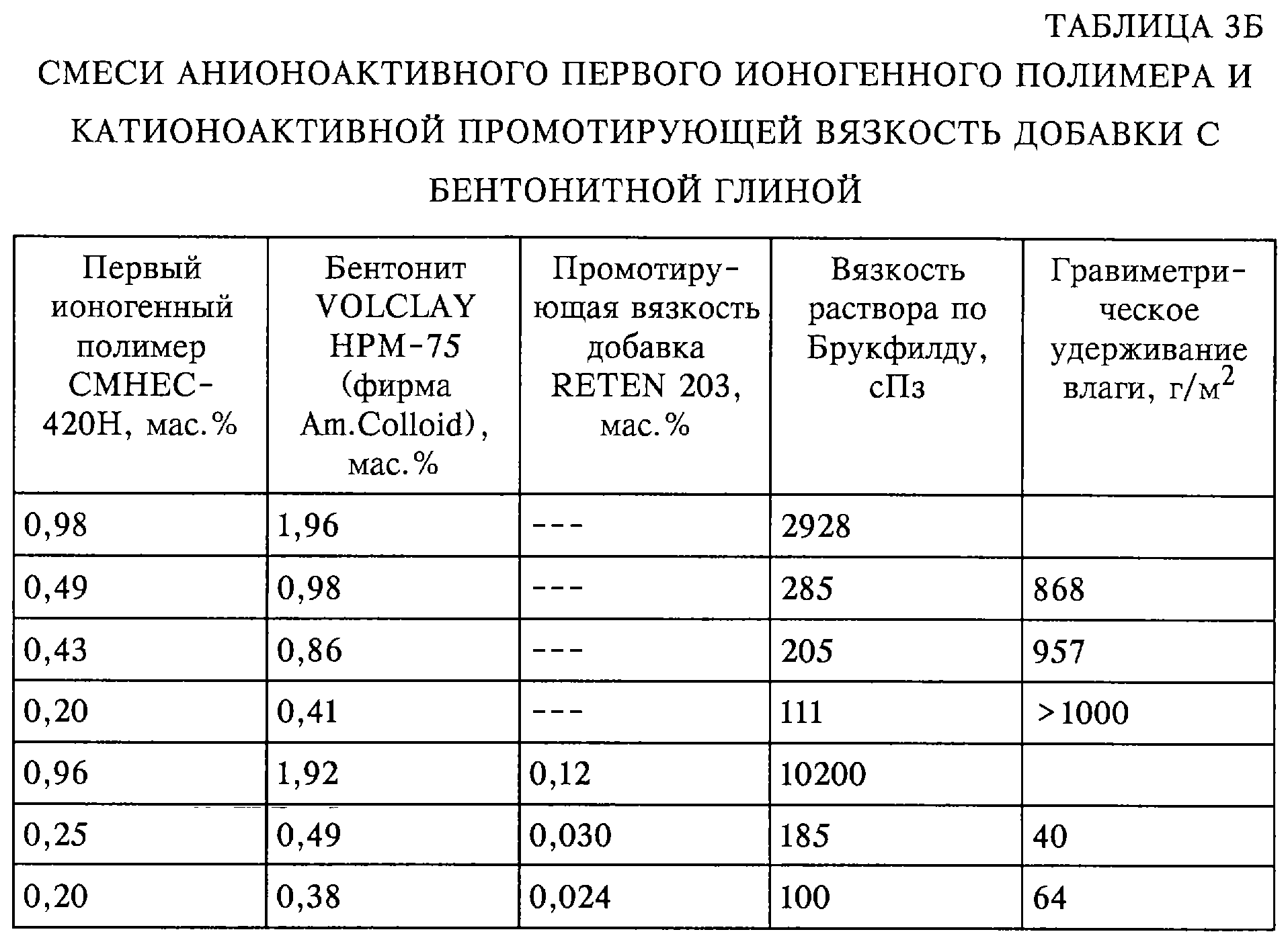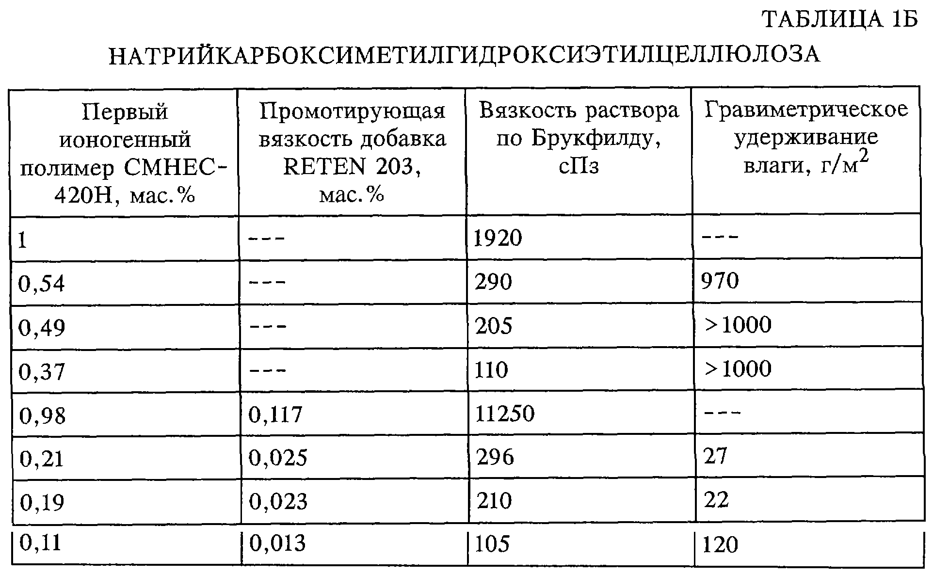 В табл.1Б первым ионогенным полимером является натрийкарбоксиметилгидроксиэтилцеллюлоза (СМНЕС-420Н; фирма Hercules Incorporated, Уилмингтон, шт. Делавэр), а промотирующей вязкость добавкой служит катионоактивный полиДАДМАХ (продукт RETEN 203; фирма Hercules Incorporated, Уилмингтон, шт. Делавэр).