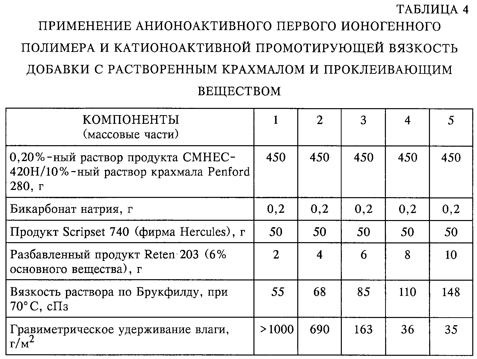 Путем варки камеди в воде в течение одного часа при 95 C с 0,20 мас.% карбоксиметилгидроксиэтилцеллюлозы СМНЕС420Н (фирма Hercules Incorporated, Уилмингтон, шт. Делавэр) готовят водный раствор 10%-ного гидроксиэтилированного крахмала Penford gum 280 (фирма Penford Products, шт. Айова). Далее загущенный крахмальный раствор охлаждают до 70 С и разделяют на аликвоты. В загущенный крахмальный раствор добавляют проклеивающее вещество, после чего в виде аликвот в крахмальный раствор добавляют разбавленного катионоактивного полимера Reten 203. При различных концентрациях катионоактивной добавки определяют вязкость по Брукфилду этого раствора и гравиметрическое удерживание влаги. В ходе проведения таких испытаний установлено, что по мере увеличения количества добавляемой катионоактивной добавки способность удерживать влагу возрастает. Эти результаты представлены в табл.4. Данные этого примера показывают возможность достижения улучшенной степени проклейки при выполнении настоящего изобретения с использованием крахмала и проклеивающих веществ при поверхностной обработке бумаги.