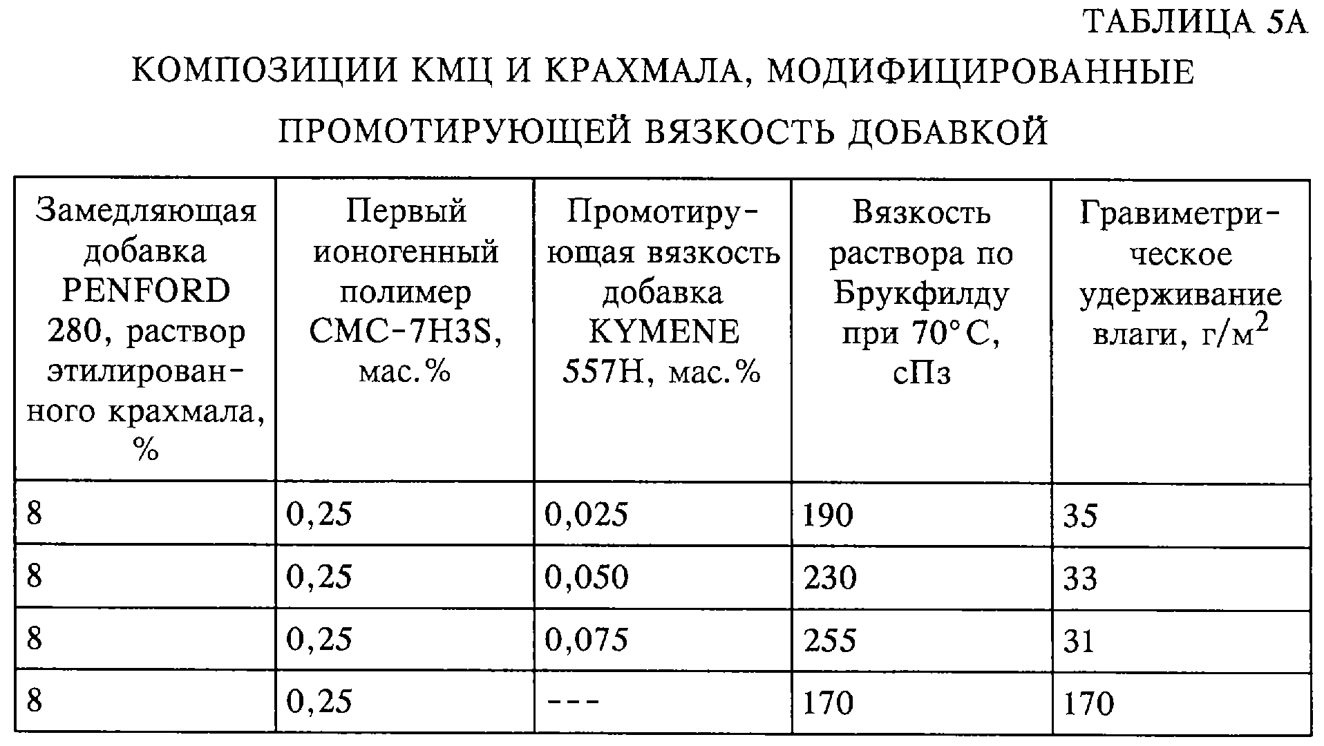 Водный раствор 8%-ного гидроксиэтилированного крахмала (PENFORD GUM 280) готовят варкой этой камеди в воде в течение одного часа при 95 С с 0,25 мас.% натрийкарбоксиметилцеллюлозы CMC-7H3SX; фирма Hercules Incorporated, Уилмингтон, шт. Делавэр. Далее загущенный крахмальный раствор охлаждают до 70 С и разделяют. В аликвоты такого крахмального раствора добавляют различные количества продукта Kymene 557H (фирма Hercules Incorporated, Уилмингтон, шт. Делавэр) и сопоставляют значения их вязкости по Брукфилду и гравиметрического удерживания влаги. Отмечают, что добавление продукта Kymene 557H вызывает увеличение как вязкости раствора, так и способности задерживать влагу в сравнении с данными контрольного испытания без использования продукта Kymene 557H. Эти результаты представлены в табл.5А.