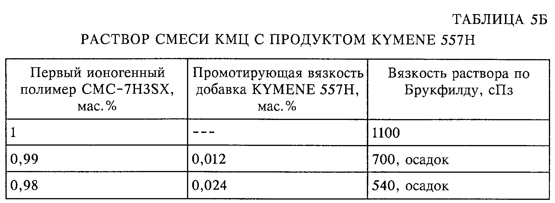 В ходе проведения параллельного испытания готовят композиции без замедляющей добавки. Готовят 1%-ный раствор продукта CMC-7H3SX, а затем определяют вязкость раствора по Брукфилду. В раствор карбоксиметилцеллюлозы (КМЦ) с перемешиванием добавляют небольшое количество катионоактивного полимера Kymene 557H. Однако в ходе проведения этого сравнительного эксперимента наблюдают наличие осадка и чем больше добавляют Kymene 557H, тем ниже становится вязкость раствора. Это указывает на обеднение водной фазы КМЦ полимером. Об этом свидетельствуют данные табл.5Б.