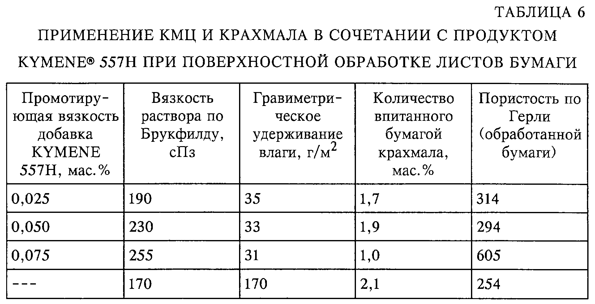 Затем приготовленными таким образом крахмальными растворами обрабатывают листы немелованной бумаги с применением метода “wire rod draw-down”. Обработанные таким образом листы бумаги сушат при постоянной температуре, после чего определяют влажность для установления количества впитанного крахмала в пересчете на сухую массу и пористости по Герли с помощью цифрового порозиметра Хагерти (фирма Hagerty Technologies Inc., Куинсбери, шт. Нью-Йорк). В ходе проведения этих испытаний устанавливают, что модифицирующая система КМЦ/Kymene 557H обусловливает достижение намного более высоких значений пористости по Герли листов бумаги, чем полученные в контрольных испытаниях. Эти результаты сведены в табл.6. Более высокое значение пористости по Герли является целевым свойством бумаги, обработанной в клеильном прессе. Этот пример демонстрирует полезность изобретения при достижении ценных характеристик текучести растворов крахмала, используемых для поверхностной обработки бумаги.