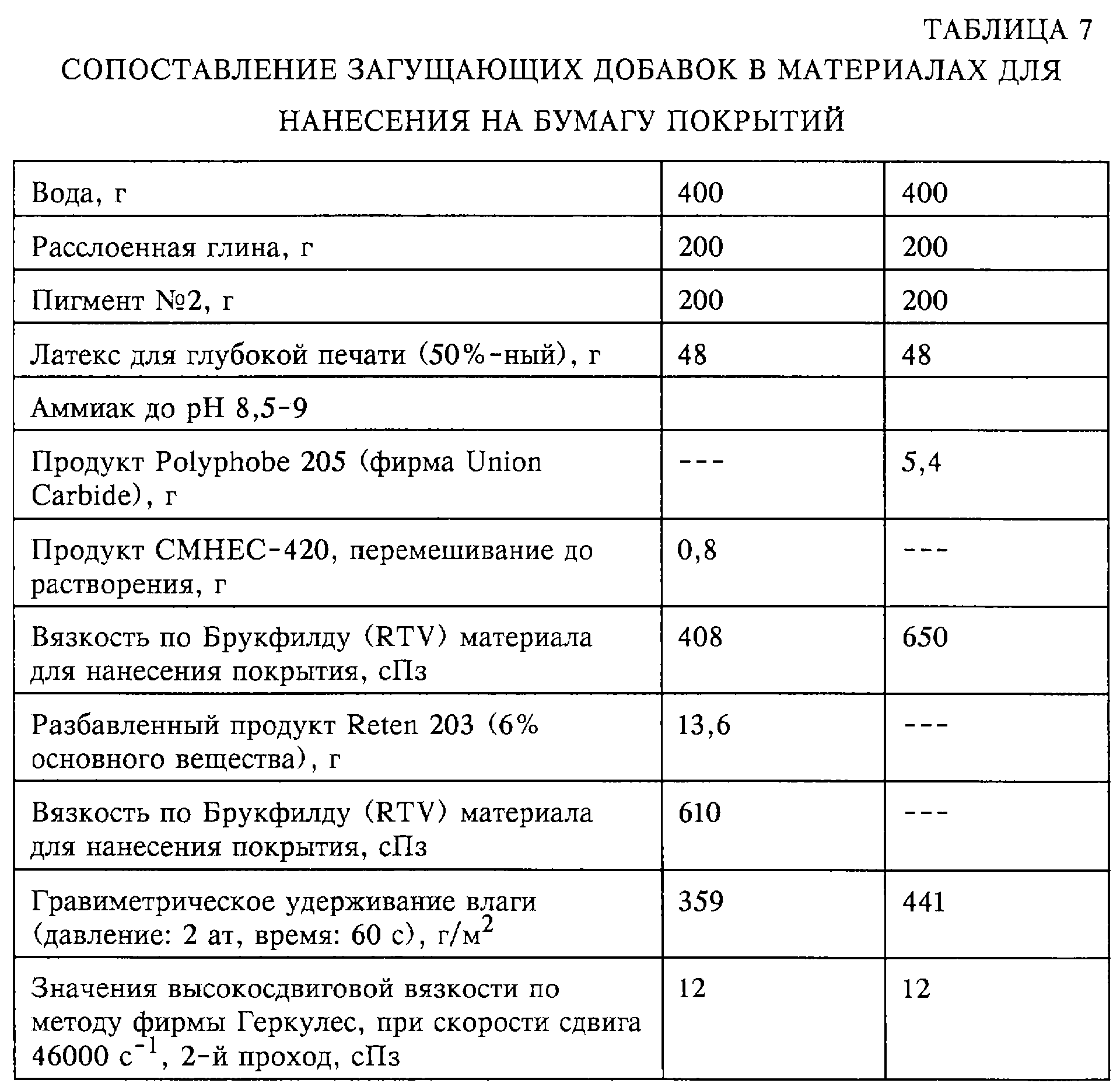 Далее определяют свойства материала для нанесения на бумагу покрытия в контрольном и сравнительном экспериментах испытания. Установлено, что сочетание продукта СМНЕС-420Н с катионоактивной добавкой обеспечивает достижение значительно улучшенной способности удерживать влагу, чем в контрольном испытании, и одновременно с этим уменьшенных высокосдвиговых значений (определяют по методу фирмы Геркулес), аналогичных полученным в контрольном эксперименте. Эти установленные факты, представленные в табл.7, указывают на полезность настоящего изобретения для придания материалам при нанесении на бумагу покрытий целевых новых свойств.