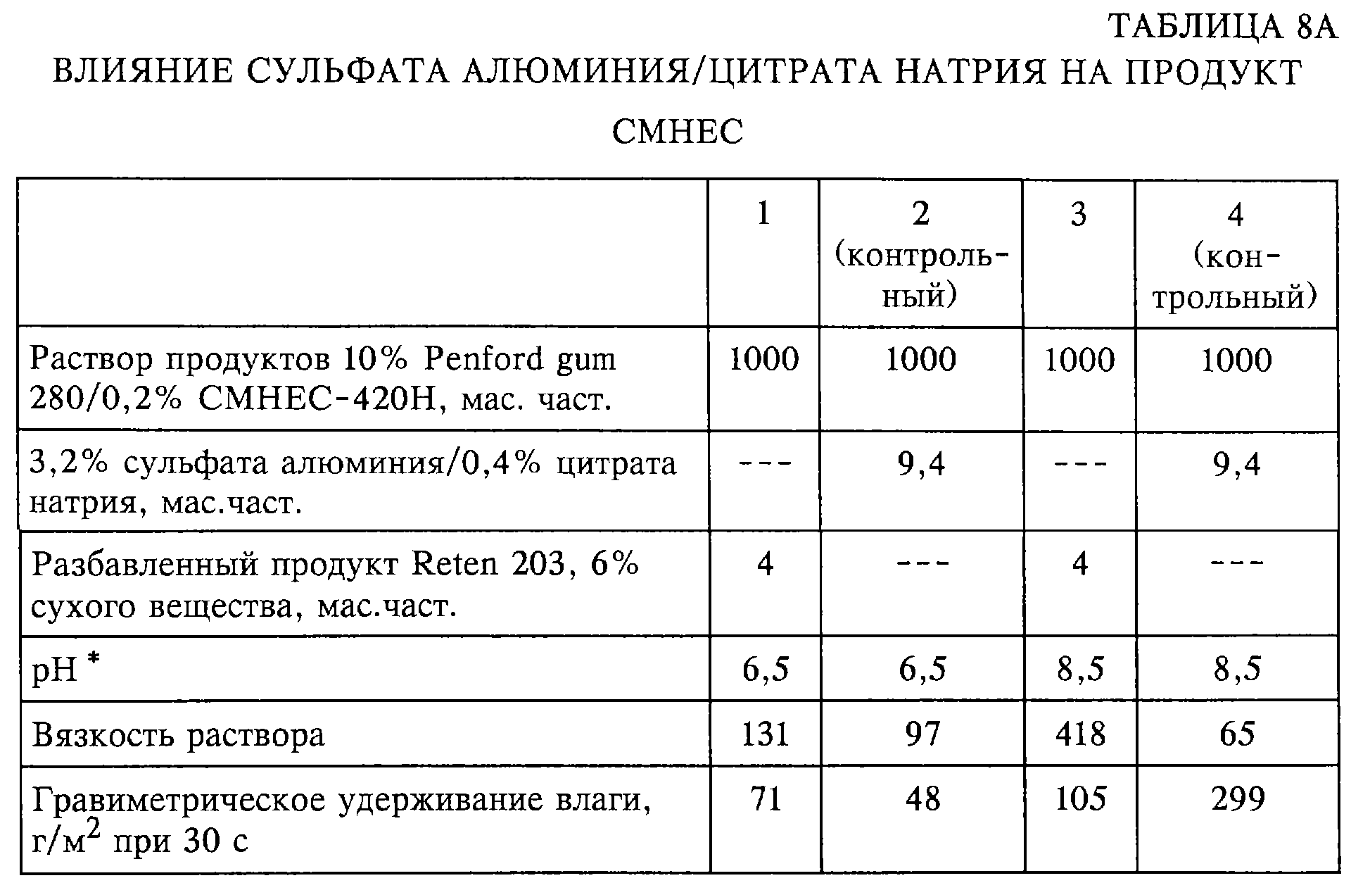 Установлено, что, как показано в таблице 1Щ, улучшение вязкости раствора с использованием продукта СМНЕС/катионоактивной добавки по настоящему изобретению гораздо значительнее, чем при использовании известной ранее смеси продукта СМНЕС/квасцов/цитрата. Установлено также, что при рН 8,5 способность удерживать влагу при выполнении настоящего изобретения заметно выше, чем в контрольном эксперименте с использованием известных средств. Можно было бы показать таким образом, что при выполнении настоящего изобретения добавление смешанного раствора сульфата алюминия/цитрата натрия по ранее опубликованному патенту US 4035195 с целью улучшения удерживания влаги раствором в условиях высоких значений рН оказывается неэффективным, что было бы типичным для многих процессов обработки в клеильном прессе.