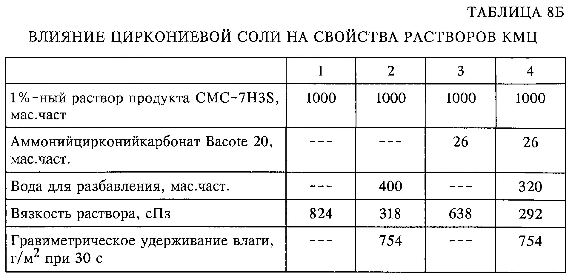 Готовят 1%-ный раствор продукта CMC-7H3S в воде и определяют вязкость. В 1000 мас.ч. этого раствора с перемешиванием добавляют 16 мас.ч. аммонийцирконийкарбоната Bacote 20 (фирма Magnesium Elektron). Установлено, что при добавлении продукта Bacote 20 вязкость раствора снижается. В ходе проведения отдельных экспериментов такое снижение вязкости наблюдают в широком интервале количеств добавляемого аммонийцирконийкарбоната. Как КМЦ, так и КМЦ/циркониевый растворы смешивают с дополнительным количеством разбавляющей воды, получая растворы с вязкостью приблизительно 300 сПз, и определяют гравиметрическое удерживание влаги. Устанавливают, что оба КМЦ раствора, т.е. как с добавленной, так и без добавленной циркониевой соли, проявляют очень похожие значения удерживания влаги. Эти результаты отражены в табл.8 Б. Таким образом показано, что при выполнении настоящего изобретения добавление циркониевой соли по ранее опубликованному патенту US 5362573 с целью улучшить удерживание влаги раствором оказывается неэффективным.