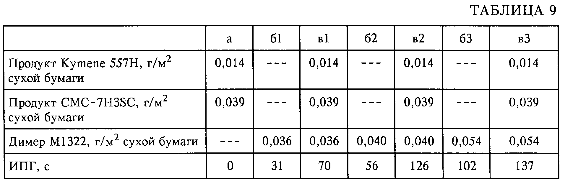 В каждом случае количество добавляемого крахмала в пересчете на сухое вещество составляет 1,8 г/м2 от количества сухой бумаги. Крахмальный раствор используют при рН 8 и 57 С, а вязкость по Брукфилду составляет примерно 20 сПз (вал №1 и 100 об/мин). Модифицирующая реологию система включает продукты Kymene 557H и CMC-7H3SC, ее добавляют на бумагу в количествах, указанных в табл.9.