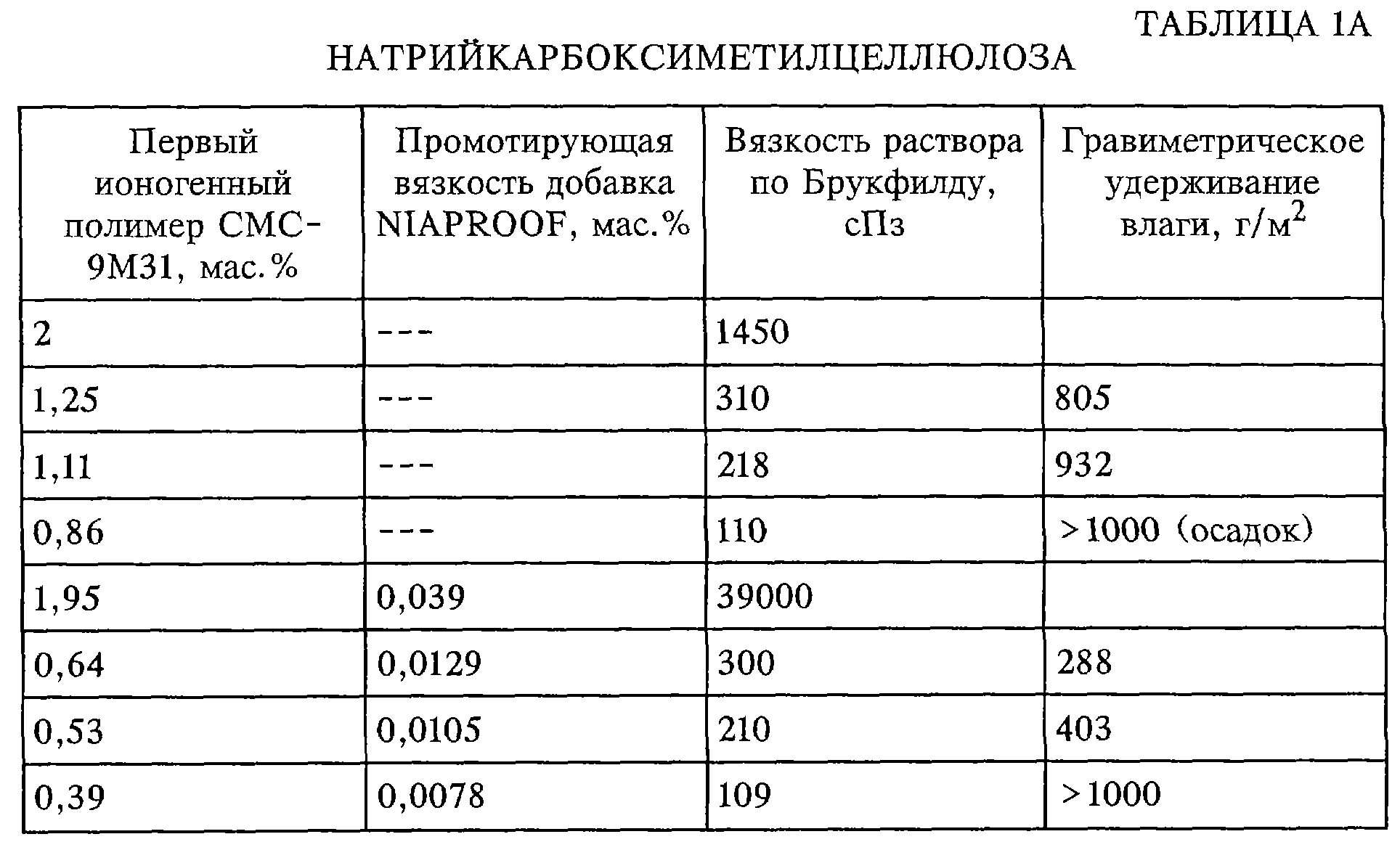 В табл.1А первым ионогенным полимером является натрийкарбоксиметилцеллюлоза (СМС-9М31; фирма Hercules Incorporated, Уилмингтон, шт. Делавэр), а промотирующей вязкость добавкой служит основный ацетат алюминия (продукт NIAPROOF, полученный на фирме Union Carbide, Нью-Йорк, шт. Нью-Йорк).