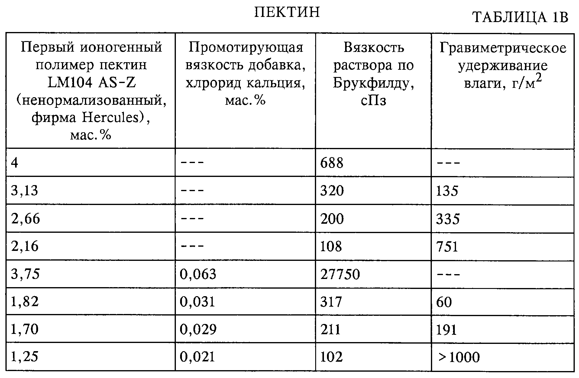 В табл.1В первым ионогенным полимером является анионоактивный пектин (ненормализованный) (продукт LM104 AS-Z; фирма Hercules Incorporated, Уилмингтон, шт. Делавэр), а промотирующей вязкость добавкой служит хлорид кальция.
