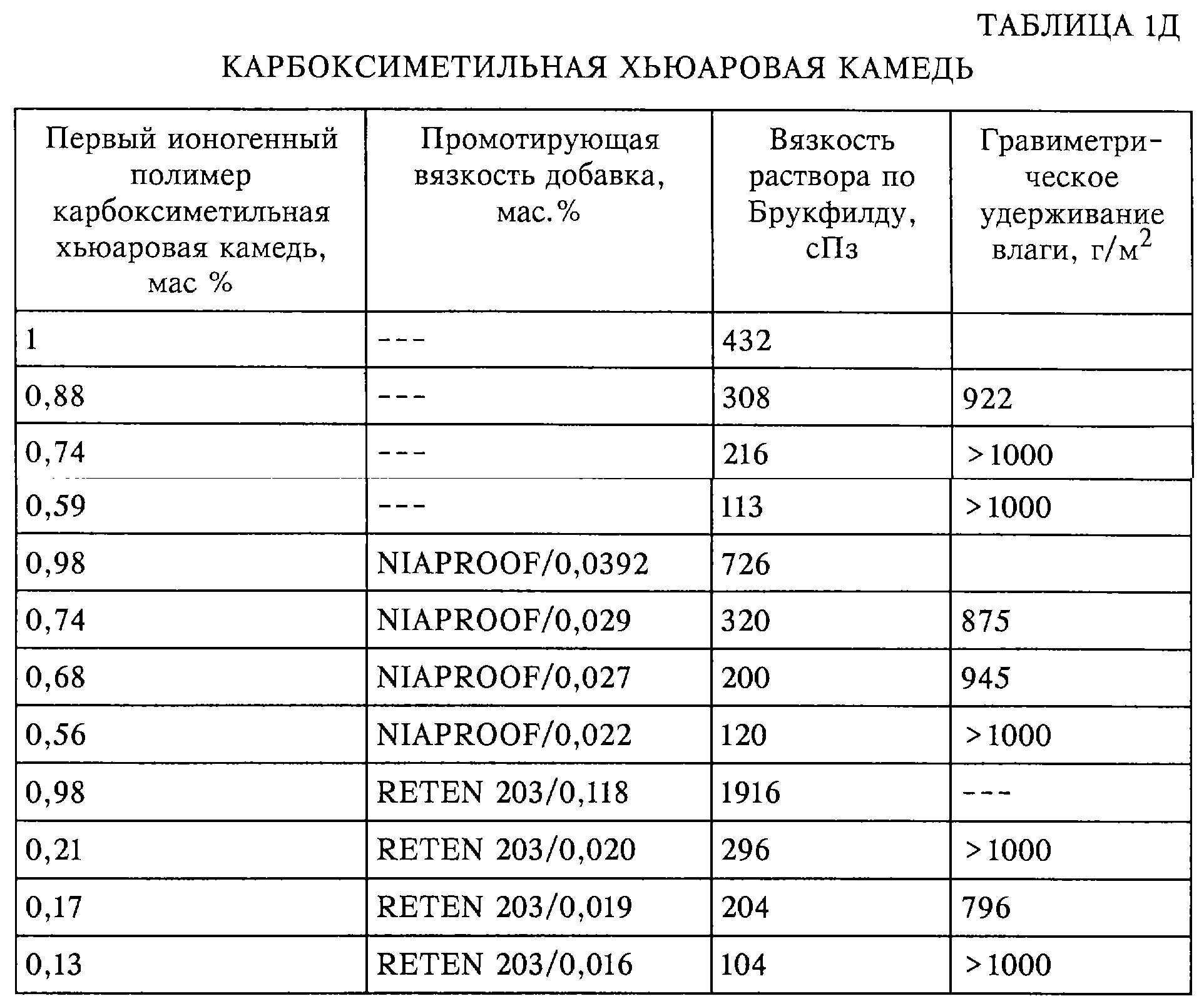 В табл.1Д первым ионогенным полимером является анионоактивная карбоксиметильная хьюаровая камедь со степенью замещения (СЗ) 0,5, а промотирующей вязкость добавкой служит основный ацетат алюминия (продукт NIAPROOF, полученный на фирме Union Carbide, Нью-Йорк, шт. Нью-Йорк) или разбавленный катионоактивный полиДАДМАХ (продукт RETEN 203; фирма Hercules Incorporated, Уилмингтон, шт. Делавэр).