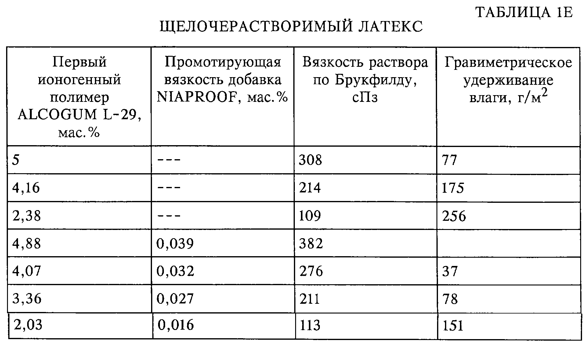В табл.1Е первым ионогенным полимером является щелочерастворимый латекс (продукт ALCOGUM L-29; фирма Aico Products, Чаттануга, шт. Теннеси), а промотирующей вязкость добавкой служит основный ацетат алюминия (продукт NIAPROOF, полученный на фирме Union Carbide, Нью-Йорк, шт. Нью-Йорк).