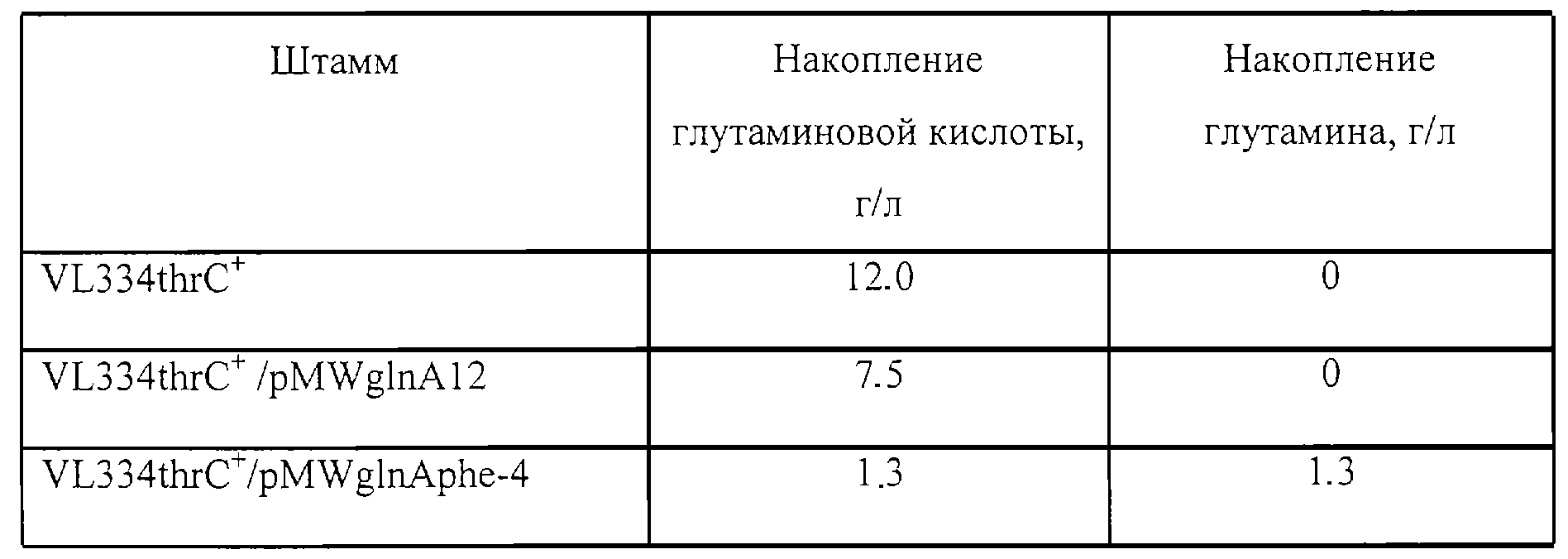 Как видно из таблицы, штамм VL334thrC+/pMWglnAphe-4, содержащий мутантный ген glnA, приобрел способность к продукции L-глутамина.