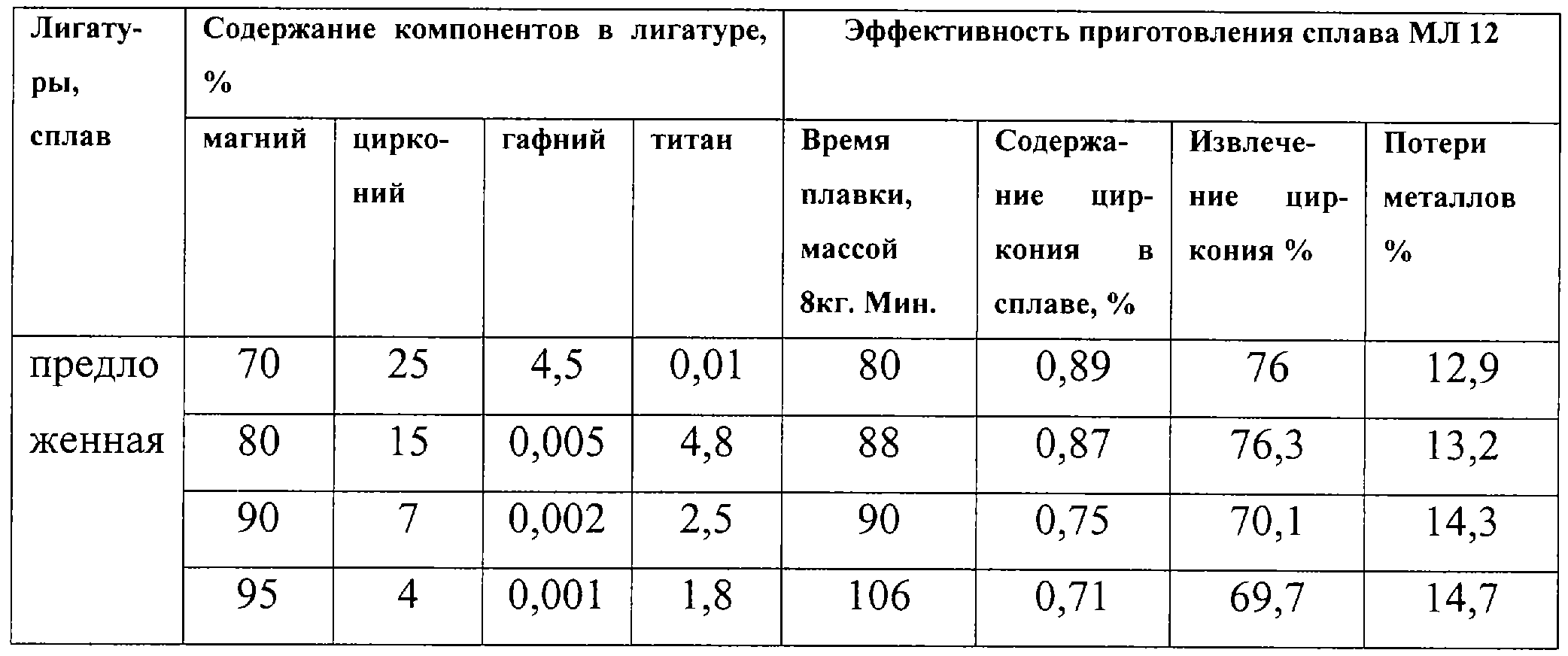 В процессе легирования титан вступает во взаимодействие с примесями с образованием TiFe2, TiFe, TiSi, TiSi3, при этом повышается чистота сплавов и вводимость циркония. Повышаются прочностные и коррозионные свойства сплавов. Эффективность приготовления магниевого сплава (например с МЛ 12) с использованием предложенной лигатуры приведены в таблице.