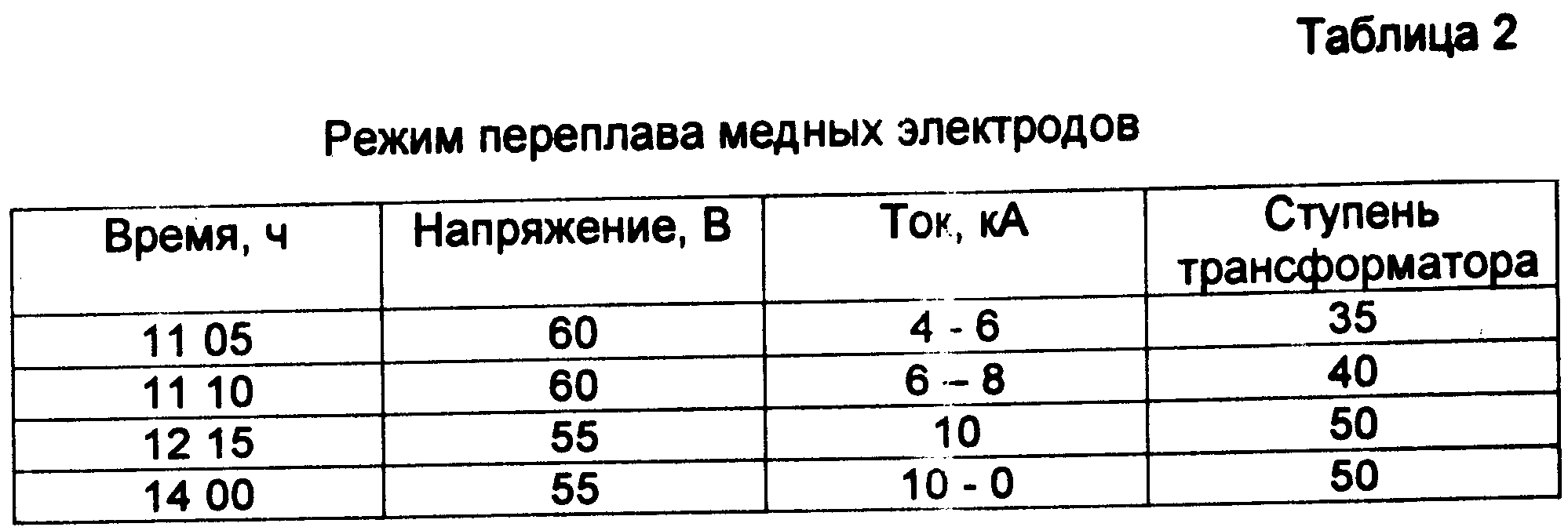 При переплаве медного электрода придерживались режима переплава, представленного в табл.2.