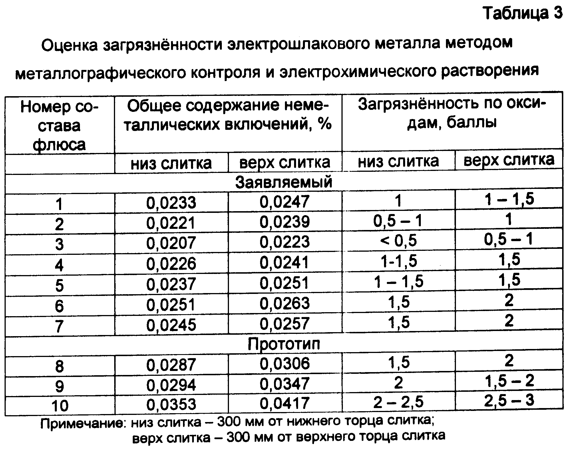 Оценку загрязненности электрошлакового металла, выплавленного с использованием заявляемого флюса и флюса прототипа, производили методом металлографического контроля и электрохимического растворения. Результаты контроля приведены в табл.3.