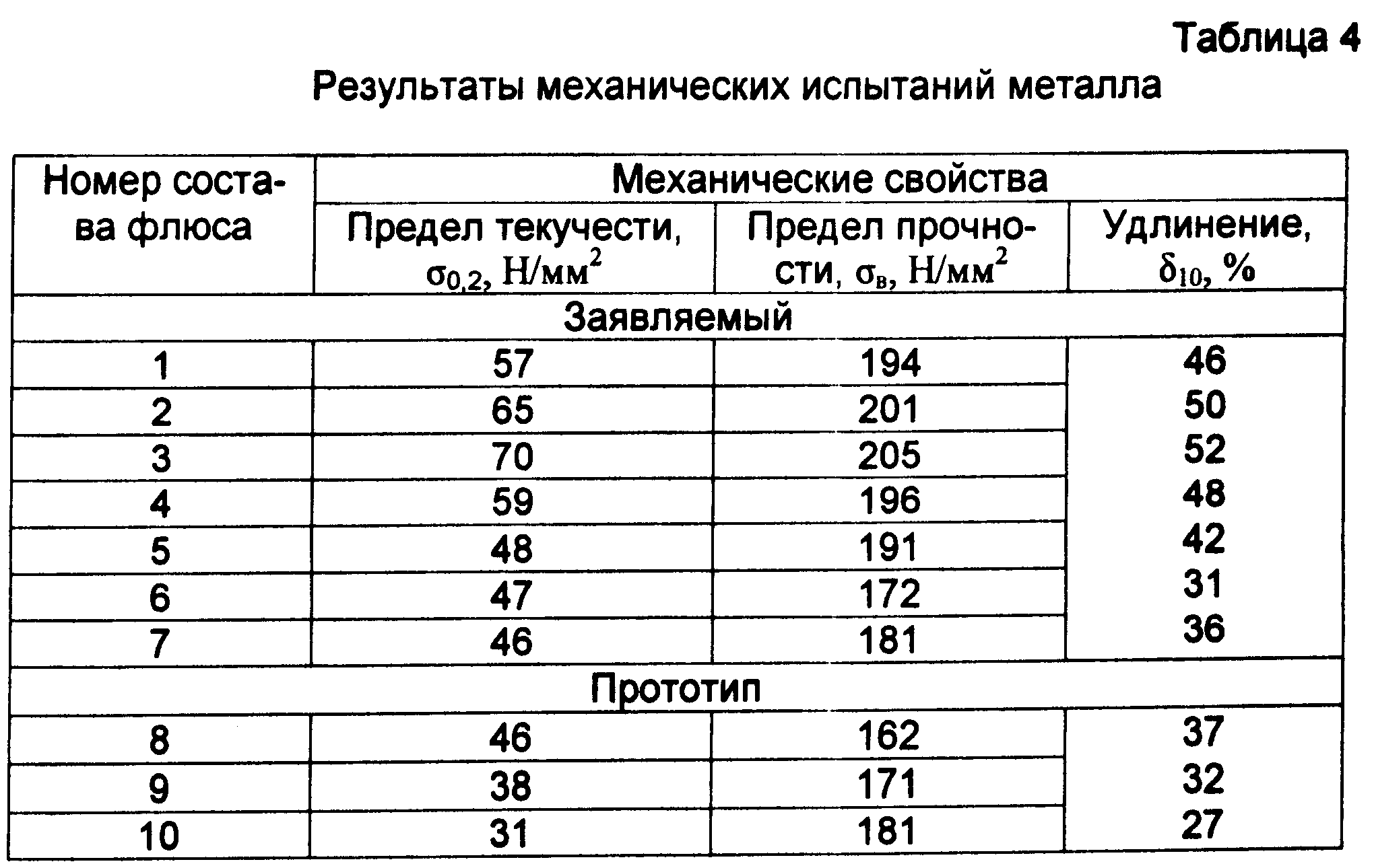 Результаты испытаний показали, что заявляемый флюс (составы 1-5) обеспечивает получение металла по сравнению с прототипом (составы 8-10) с повышенным комплексом механических свойств: предел текучести увеличивается в 1,3-1,8 раза, предел прочности в 1,13-1,18 раза, удлинение в 1,3-1,7 раза выше.