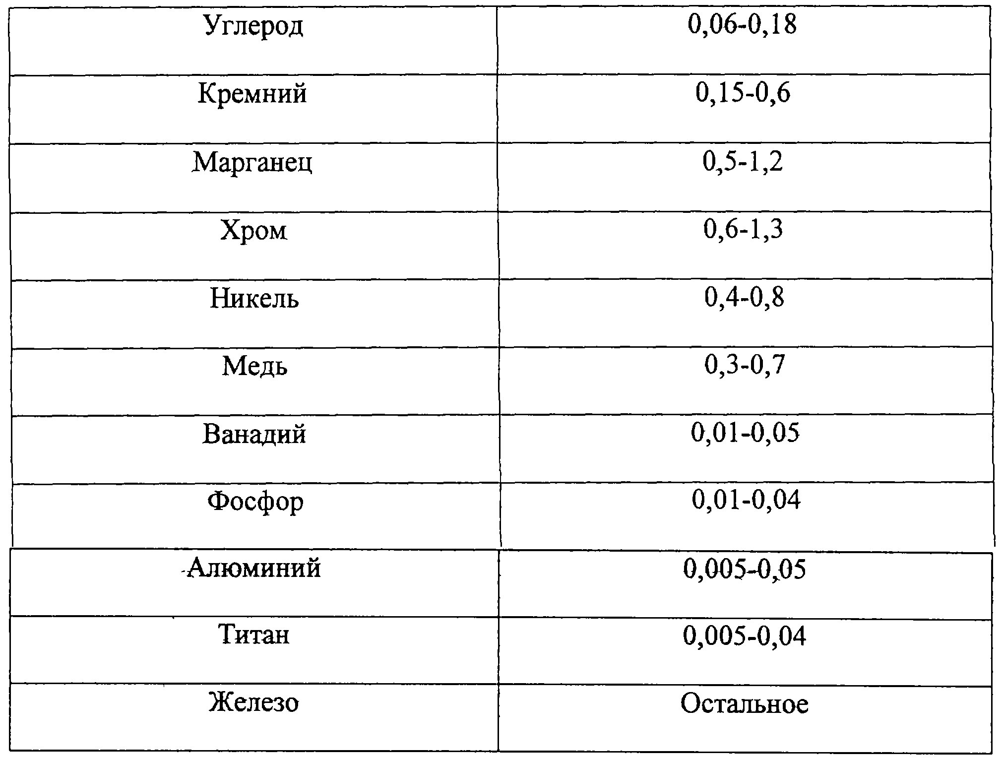Формула изобретения 1. Атмосферокоррозионно-стойкая низколегированная сталь, включающая углерод, кремний, марганец, хром, никель, медь, алюминий, титан и железо, отличающаяся тем, что она дополнительно содержит ванадий и фосфор при следующем соотношении, мас.%: Углерод 0,06-0,18 Кремний 0,15-0,6 Марганец 0,5-1,2 Хром 0,6-1,3 Никель 0,4-0,8 Медь 0,3-0,7 Ванадий 0,01-0,05 Фосфор 0,01-0,04 Алюминий 0,005-0,05 Титан 0,005-0,04 Железо Остальное 2. Сталь по п.1, отличающаяся тем, что она дополнительно содержит церий в количестве 0,001-0,005%. |