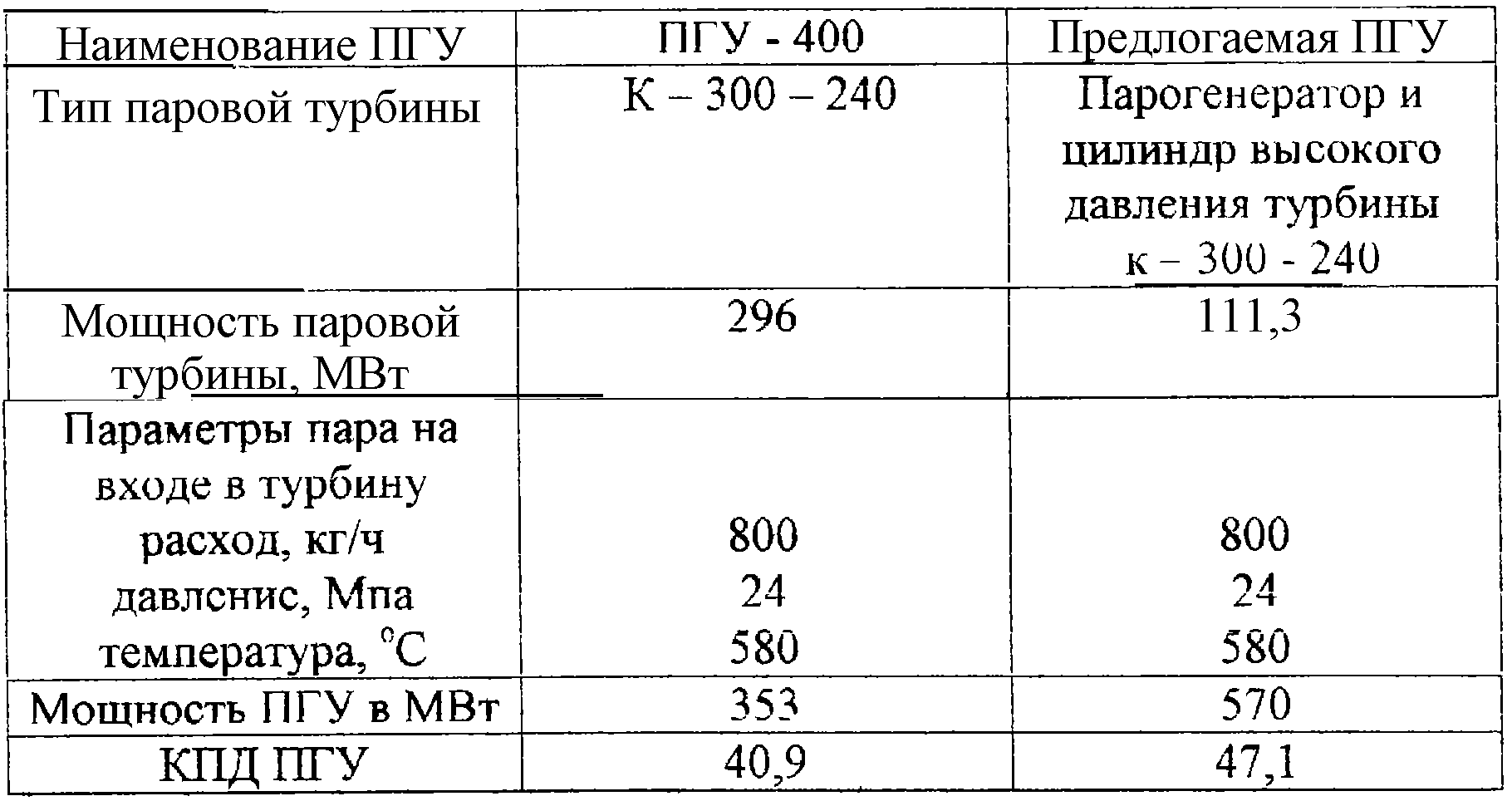 В таблице приведены сравнительные данные ПТУ со сбросом отработавших газов газовой турбины в топку парогенератора (аналог) и предлагаемой парогазовой установки