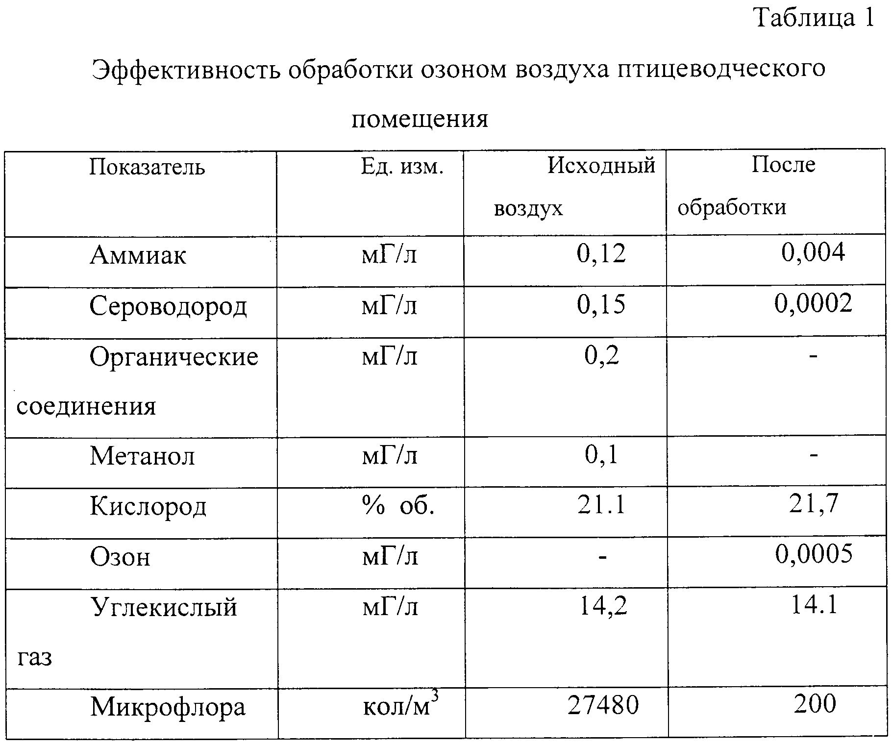 (57) Реферат: Изобретение относится к способам очистки воздушной среды, преимущественно сельскохозяйственных помещений (птичников и других) для выращивания животных. В частности изобретение может использоваться и в других случаях, например в замкнутых системах жизнеобеспечения. Способ очистки воздушной среды животноводческих помещений включает обработку воздуха озоном, при этом воздух, поступающий из животноводческого помещения, обрабатывают озоном, количество которого составляет от 0,2 до 10 мг/м3 воздуха и затем обработанный воздух подают в теплицу или оранжерею, откуда его снова подают в животноводческое помещение. В результате использования предлагаемого способа воздушная среда очищается озоном от аммиака, сероводорода и других вредных компонентов, а углекислый газ поглощается растениями и одновременно воздух перед подачей в животноводческое помещение насыщается кислородом. 1 з.п. ф-лы, 1 ил., 1 табл. Изобретение относится к способам очистки воздушной среды, преимущественно сельскохозяйственных помещений (птичников и других) для выращивания животных. В частности изобретение может использоваться и в других случаях, например, в замкнутых системах жизнеобеспечения. Известно, что воздух животноводческих помещений содержит значительное количество микрофлоры, а также газообразных веществ, образующихся в результате жизнедеятельности животных (птицы) – аммиак, сероводород, меркаптаны и углекислый газ. Наличие загрязняющих веществ влияет на продуктивность взрослой птицы и особенно молодняка, а наличие микрофлоры приводит к заболеваниям и даже гибели. Для улучшения условий содержания птицы воздух из животноводческих помещений вентиляторами выбрасывается наружу, а приточный воздух другими вентиляторами подается внутрь помещения. В холодное время года наружный воздух, перед подачей в помещение, подогревается. Например, на взрослую особь птицы (курица-несушка), по установленным нормам требуется 4-6 м3 воздуха в час. При одновременном содержании в птичнике, в среднем 15000-20000 голов, в него следует подавать 60000-120000 м3 свежего воздуха. Очевидно, что в зимний период требуется огромное количество энергии для подогрева приточного воздуха. Для уменьшения затрат энергии на подогрев приточного воздуха применяют частичную рециркуляцию воздуха. Но рециркулирующий воздух необходимо очистить от микрофлоры и газообразных примесей. Наиболее просто это удается сделать, обработав воздух озоном. Известен способ обработки воздуха помещений с целью улучшения санитарно-гигиенического состояния путем обработки его озоном (а.с. СССР №883610 МКИ F 24 F 3/66). Озон эффективно уничтожает микрофлору, а также многие вредные вещества, в том числе аммиак, сероводород и другие. Продуктами реакции являются нейтральные соединения – обычно соли неорганических кислот, углекислый газ и пары воды. В таблице 1 представлены данные по составу воздуха птичники до и после обработки озоном. Но обработанный таким образом воздух непригоден для подачи в животноводческое помещение из-за высокого содержания углекислого газа. Углекислый газ оказывает негативное влияние на развитие и продуктивность птицы, а избыток влаги в воздухе также нежелателен.