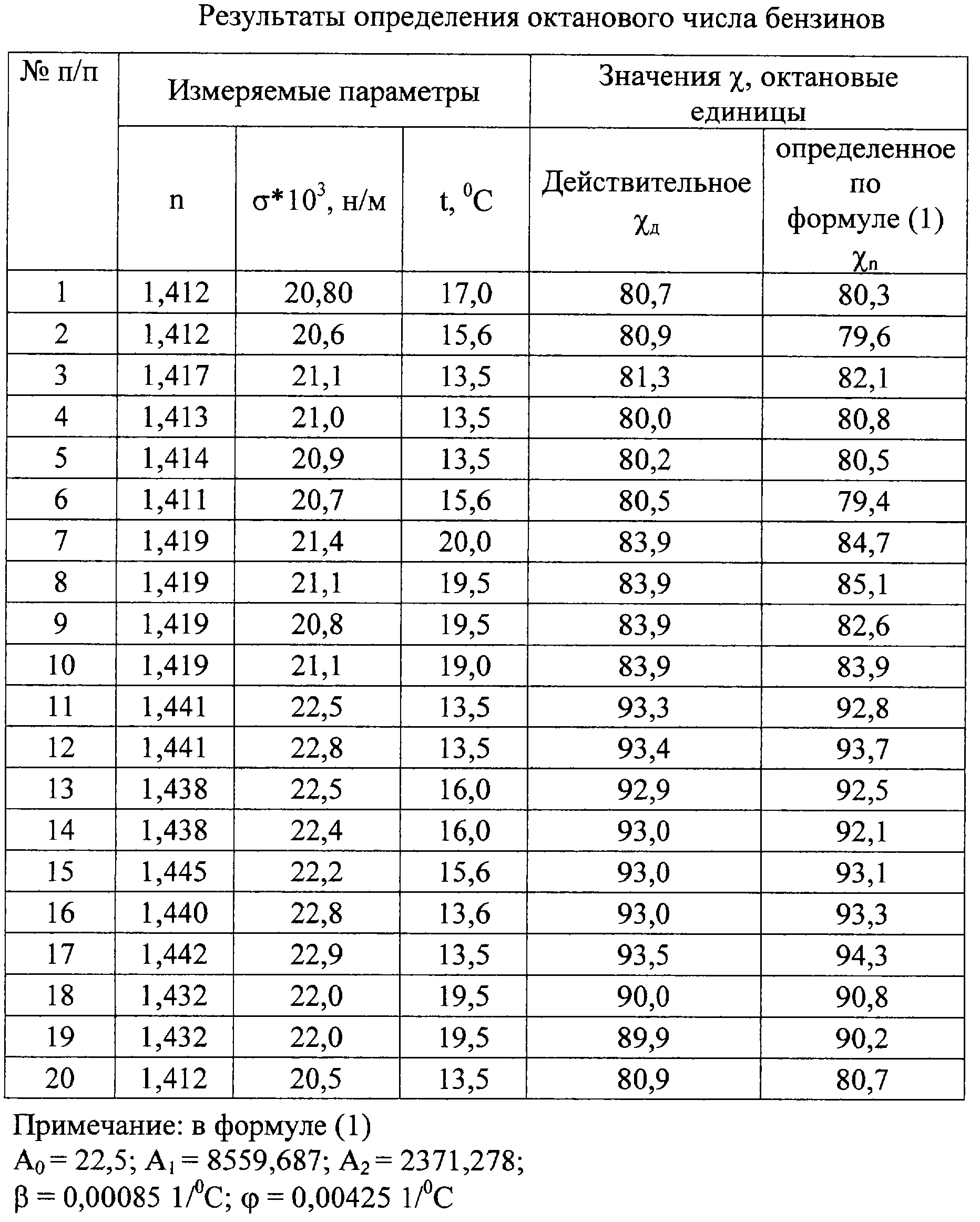 Формула изобретения Способ определения октанового числа автомобильных бензинов, включающий определение значений информативного параметра для различных эталонных бензинов, построение калибровочной зависимости информативного параметра от октанового числа этих бензинов, определение значения информативного параметра пробы анализируемого бензина и определение по калибровочной зависимости октанового числа анализируемого бензина, а также измерение плотности и температуры пробы анализируемого бензина, отличающийся тем, что дополнительно измеряют коэффициент преломления анализируемого бензина, а в качестве информативного параметра используют поверхностное натяжение анализируемого бензина, при этом октановое число определяют в интервале температур 10 40 С по следующей зависимости: