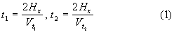 где Vt1 и Vt2 – скорости распространения сдвиговых волн с поляризациями вдоль и поперек прокатки, а Hх – неизвестная толщина листа в точке прозвучивания. Из соотношений (1) следует, что