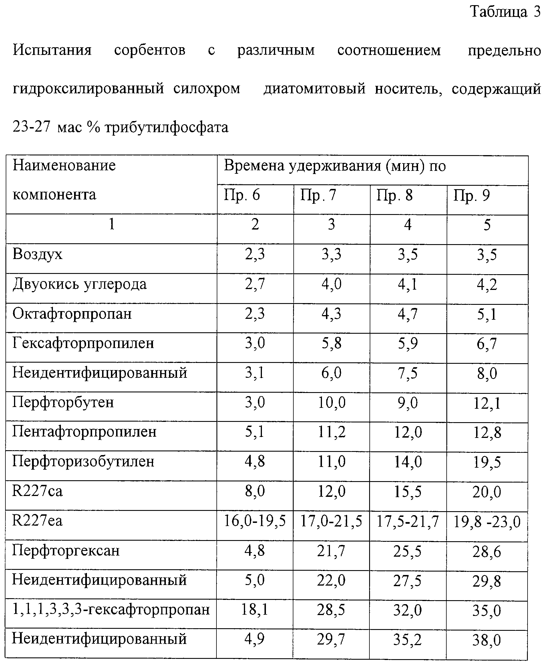 Примеры 3-5 (контрольные). С целью установления оптимальной степени гидроксилирования поверхности силохрома для достижения необходимой селективности анализируют пробу R227ea, содержащего перфторизобутилен, R227сa и другие фторорганические примеси. В качестве сорбента используют силохром предельно гидроксилированный (пример 3), предельно дегидроксилированный (пример 4) и частично гидроксилированный (пример 5). Регистрация компонентов проводится с использованием детектора по теплопроводности. Данные результатов анализов по примерам 3-5, представленные в таблице 2, показывают, что только предельно гидроксилированный силохром позволяет в максимальной степени решить поставленную техническую задачу и получить наилучшее разделение компонентов пробы.
