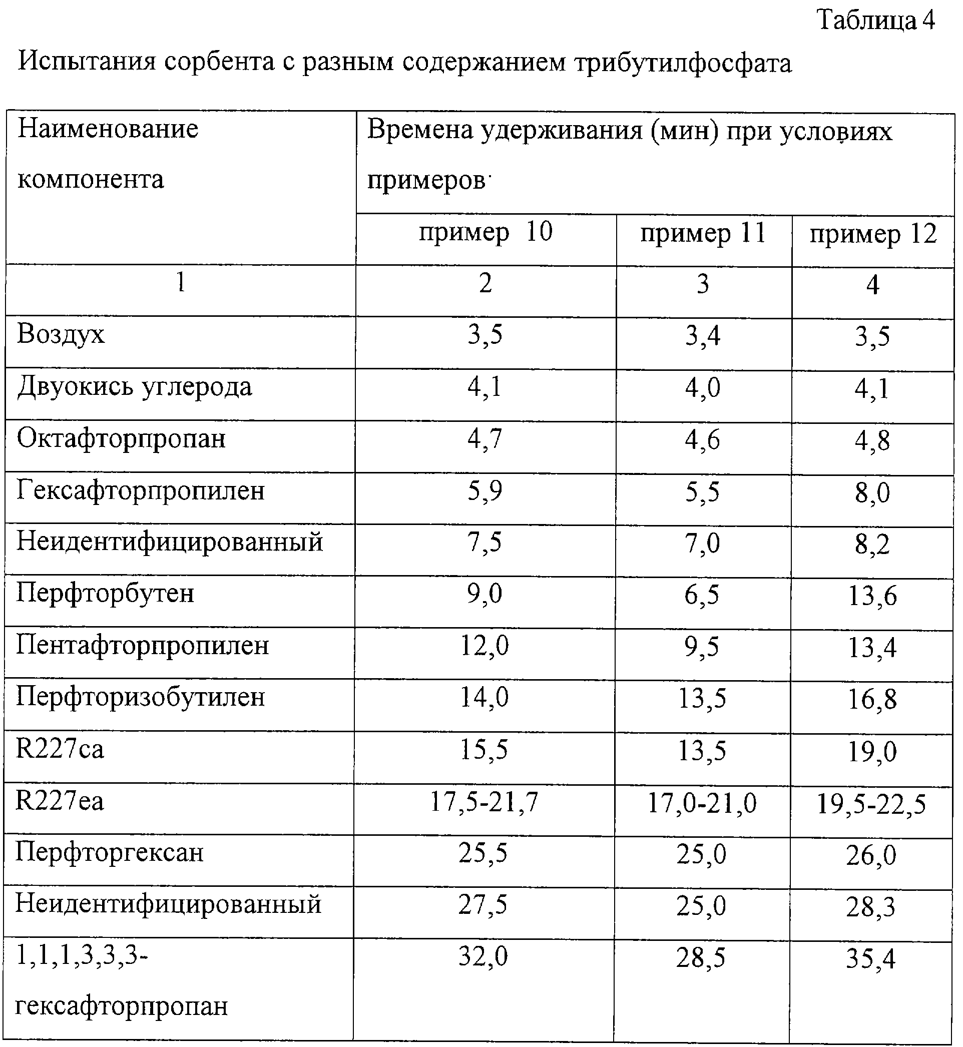 Примеры 10, 11, 12. С целью определения оптимального содержания неподвижной фазы на диатомитовом носителе анализируют пробу R227ea, содержащего в своем составе перфторизобутилен, R227ca, перфторгексан и другие фторорганические примеси. Регистрация компонентов смеси осуществляется с помощью детектора по теплопроводности. Условия анализа – в соответствии с таблицей 1, но в качестве второй (добавочной к предельно гидроксилированному силохрому) составляющей сорбента использовали диатомитовый носитель с различным содержанием трибутилфосфата. При этом в примере 11 (контрольный) использовали диатомитовый носитель, содержащий 20 мас.% трибутилфосфата, в примере 12 (контрольный) – диатомитовый носитель, содержащий 30 мас.% трибутилфосфата. Пример 10 – по настоящему изобретению. Результаты анализа, приведенные в таблице 4, показывают, что оптимальное содержание трибутилфосфата на диатомитовом носителе 23-27 мас.%. Только в этом случае достигается полное разделение “легких примесей” и возможно определение содержания перфторизобутилена и R227ca в основном компоненте – R227ea.