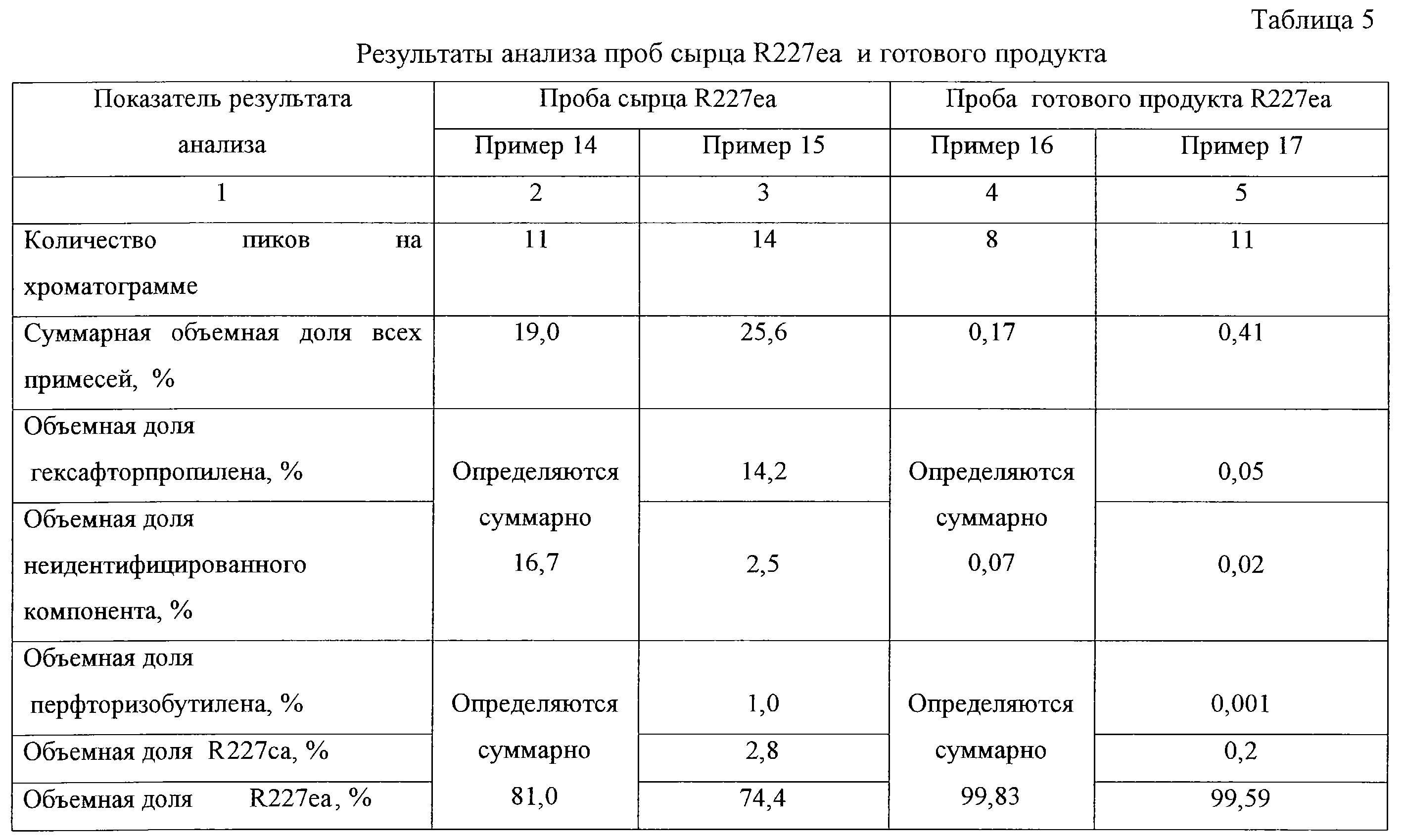 Примеры 14-17. Проводят анализ двух проб: сырца и готового продукта R227еа по прототипу и предлагаемому способу, при этом в примерах 14 (контрольный по прототипу) и 15 (по изобретению) анализируют сырец с детектором по теплопроводности, в примерах 16 (контрольный по прототипу) и 17 (по изобретению) – готовый продукт с детектором ионизации в пламени. Результаты анализа приведены в таблице 5.