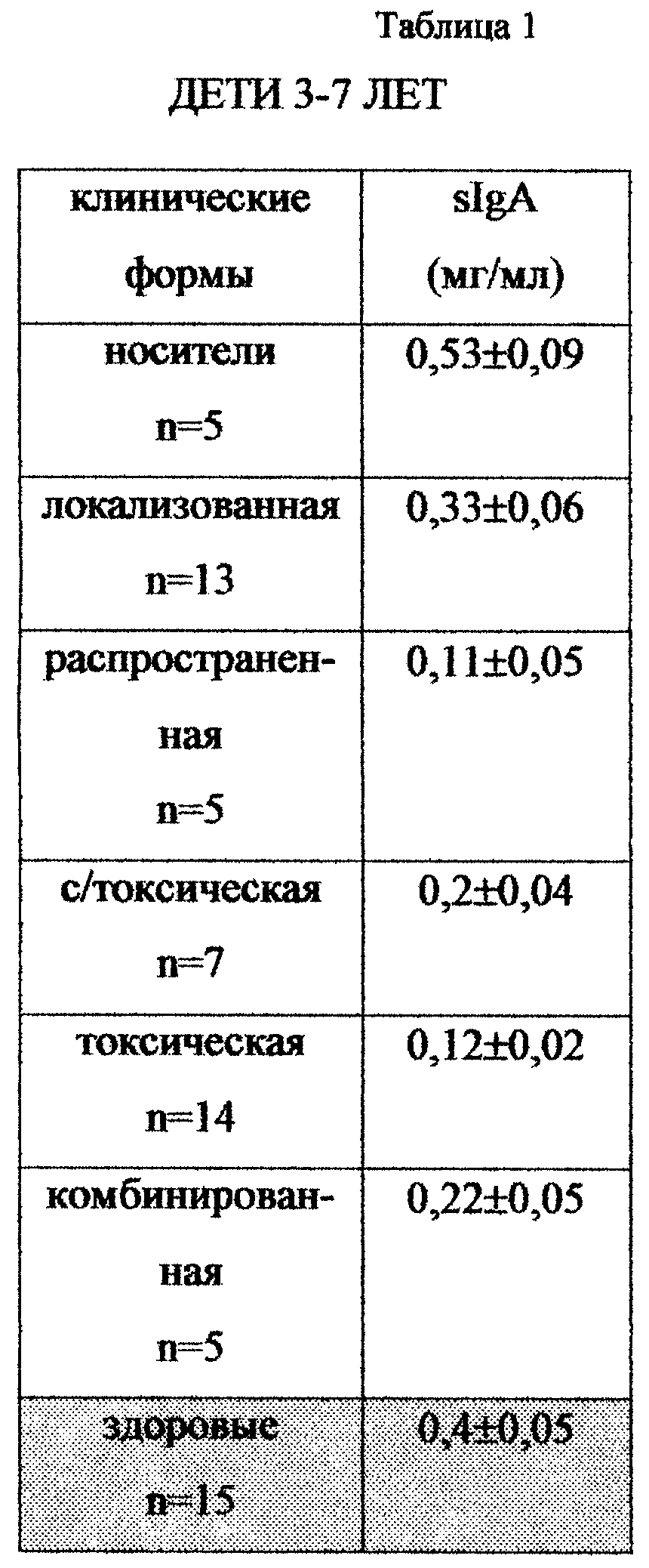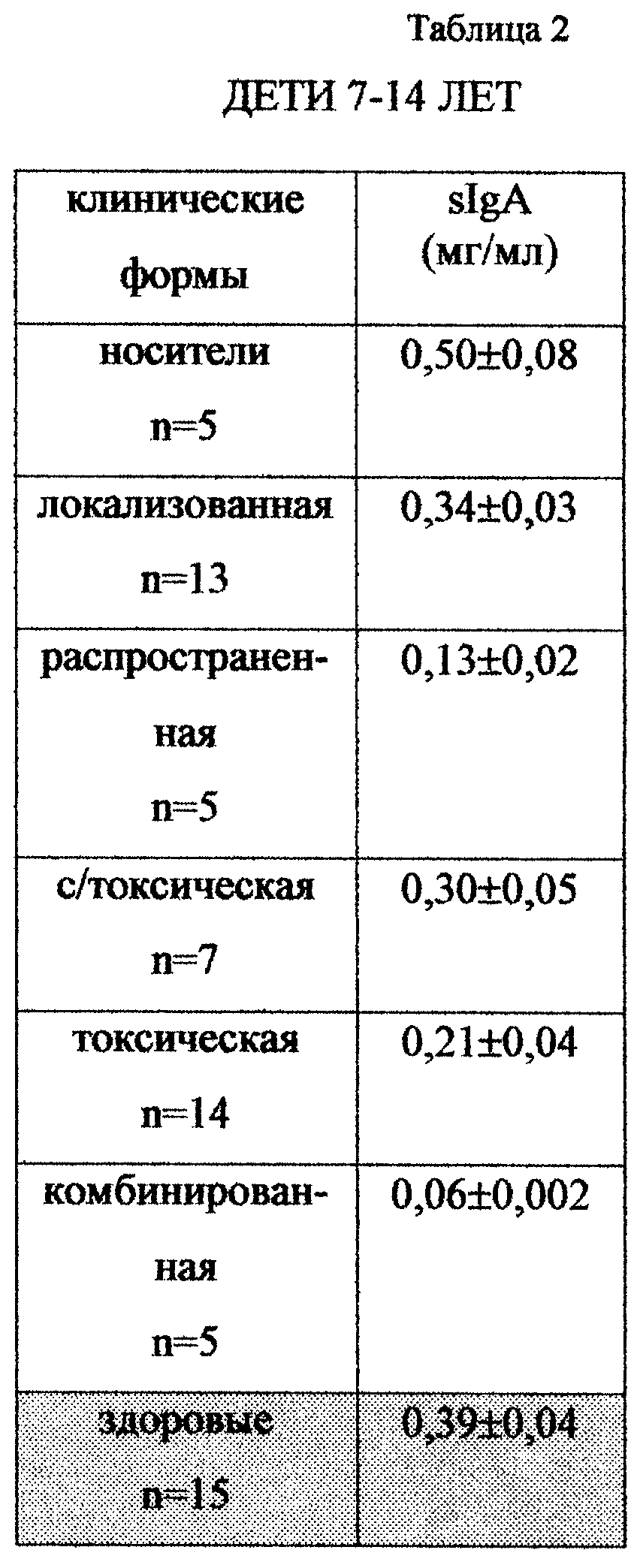 (57) Реферат: Изобретение относится к области медицины, а именно к педиатрии, и может быть использовано для прогнозирования тяжести течения инфекционных заболеваний ротоглотки у детей. Сущность изобретения состоит в определении методом радиальной иммунодиффузии в геле количества секреторного иммуноглобулина А в слюне и значения ниже 0,4±0,05 мг/мл свидетельствуют о тяжелом течении заболевания. Техническим результатом является упрощение, ускорение, повышение точности прогнозирования тяжести течения инфекционных заболеваний ротоглотки у детей. 2 табл. Изобретение относится к области медицины, а именно к педиатрии, и может найти применение в лечебно-профилактических учреждениях здравоохранения для прогнозирования тяжести течения инфекционных заболеваний ротоглотки у детей. Известно, что входными воротами инфекционных заболеваний ротоглотки является слизистая ротоглотки. Микроорганизмы (бактерии, вирусы) фиксируются на клетках тканей, размножаются и в процессе жизнедеятельности продуцируют токсические вещества, оказывающие как местное, так и общее воздействие, обусловливающее все явления патологического процесса. Начальный этап инфекционного процесса при инфекционных заболеваниях ротоглотки характеризуется специфическим взаимодействием возбудителя с клетками хозяина. Секреторный иммуноглобулин A (sIgA) – основной иммуноглобулин секрета слизистых, блокирующий адгезию микроорганизмов к эпителиоцитам, тем самым обеспечивая локальную иммунную защиту. Количественная характеристика sIgA позволяет оценить состояние барьерных функций слизистых вместе вегетации, персистенции микроба и установить прогностические критерии течения инфекционного процесса. Проведенный поиск по научно-медицинской и патентной литературе выявил различные способы диагностики дифтерии. Известен “Способ экспресс-диагностики дифтерии у детей” – патент 2129276 Россия, МПК G 01 N 33/53 /Мельникова А.В., Железникова Г.И., Иванова В.В./, опубл. 20.04.99 бюл. №11 путем выявления дифтерийного токсина в составе циркулирующих иммунных комплексов (ЦИК). Недостатком этого метода является использование для исследования сыворотки крови, что требует проведения внутривенных манипуляций. Известен “Способ определения течения токсической дифтерии” – патент 2135998 Россия, МПК G 01 N 33/52 /Амбалов Ю.М., Пополитова C.Б., Усаткин А.В./, опубл. 27.08.99 бюл. №24 путем оценки биохимических показателей крови. Недостатки этого метода заключаются в том, что материалом для исследования служит плазма крови, sIgA. Метод, основанный на определении активности ферментов, требует особого режима проведения исследования, от которого зависит качество полученных результатов. Наиболее близким способом прогнозирования формы тяжести дифтерии является “Способ прогнозирования течения дифтерийной инфекции у детей” – патент 2146055 Россия, МПК G 01 N 33/569 / Иванова В.В., Быценко Д.С., Кветная А.С./, опубл. 27.02.2000 БИПМ №6. Этот способ взят в качестве прототипа. Способ заключается в определении микробной резистентности слизистой фарингеального эпителия с помощью выявления секреторного иммуноглобулина А на основе реакции иммунофлюоресценции и определения чувствительности эпителиоцитов к адгезии микробных клеток. Недостатком метода является его сложность, обусловленная тем, что определение проводят на эпите