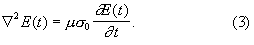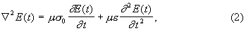 Известно, что электромагнитное поле в плохо проводящей физической среде распространяется по времени t согласно вытекающему из первого и второго уравнений Максвелла дифференциальному затухающему волновому уравнению математической физики для напряженности электрического поля, в том числе и в случае ее импульсного изменения,
