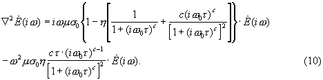 Как видно, уравнение (10) по форме не отличается от затухающего волнового уравнения для напряженности электрического поля (2) для случая импульсного изменения величин электромагнитного поля. И хотя коэффициент при меньше, чем коэффициент при , но все же не настолько как по сравнению с 0 в проводящей неполяризующейся среде, и пренебрегать вторым членом этого уравнения уже недопустимо.