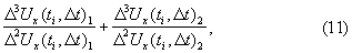 2Uх(ti, t)1, 2Uх(ti, t)2 – разности значений между разделенными промежутками времени t двумя ближайшими мгновенными значениями вторых осевых разностей электрических потенциалов, измеренных в паузах тока на всем протяжении существования каждой из этих пауз, при подаче токов соответственно в первый и второй дипольные электрические источники;