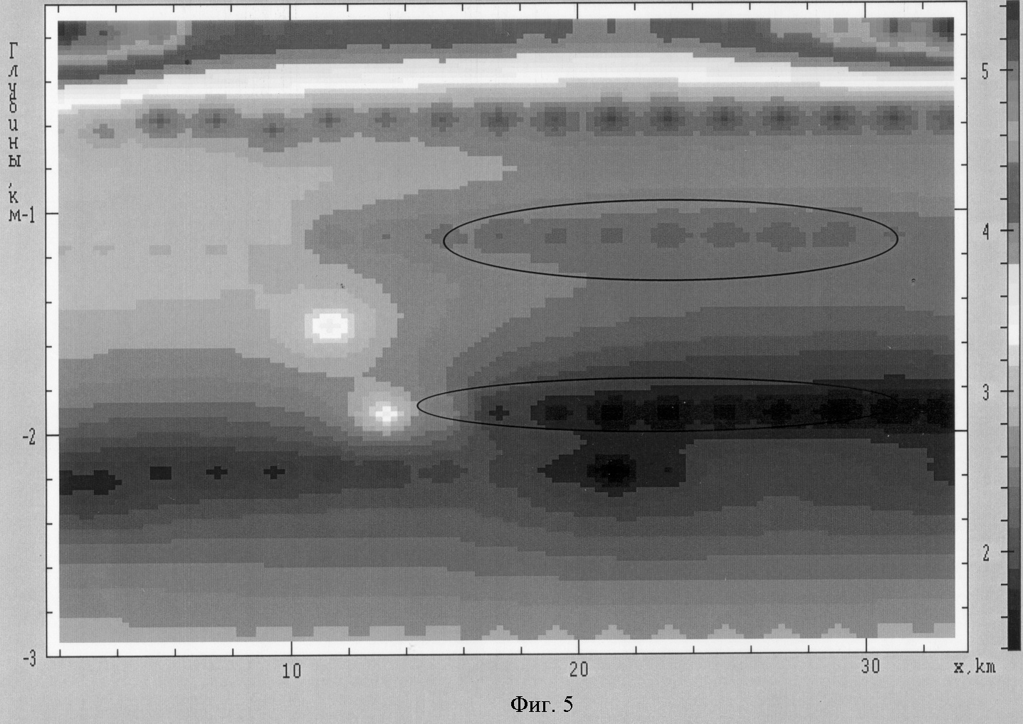 На фиг.5 показан пример временного разреза по натуральному логарифму удельного электрического сопротивления (ln ) на одном из профилей зондирования.
