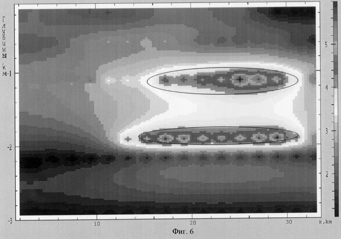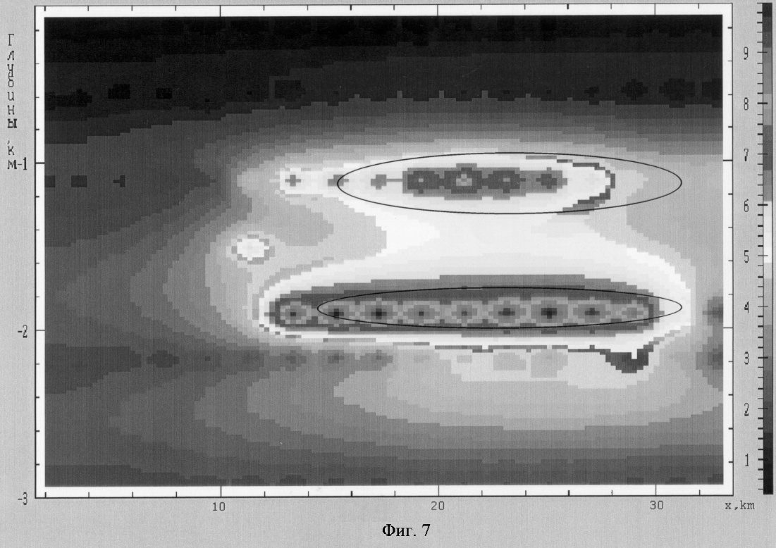 На фиг.6 показан временной разрез по параметру вызванной поляризации на том же примере, что и на фиг.3. На этой фигуре четко проявляются две аномалии вызванной поляризации (зелено-красный цвет): первая – на глубине примерно от 1 км до 1,2 км и по профилю от 16 км до 31 км (приуроченная к газовой залежи в Сеноманском горизонте); вторая – на глубине примерно 2 км и по профилю от 14 км до 32 км (приуроченная к газоконденсатной залежи в Альб-Абтском горизонте).