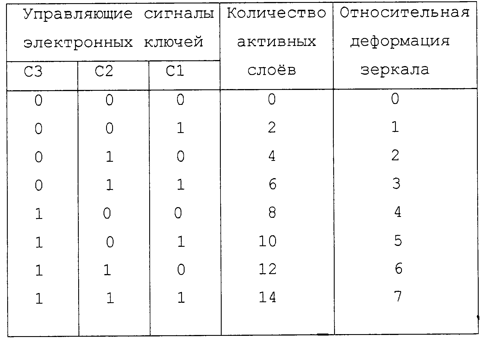 Твердотельный модулятор волнового фронта работает следующим образом. С выходного регистра системы управления на управляющие входы цифровых электронных ключей 14, 15, 16 поступают управляющие сигналы С1, С2, С3, соответствующие разрядам двоичного кода деформации данного адреса. В зависимости от значения управляющих сигналов (“1” или “0”) цифровые электронные ключи переходят в открытое или закрытое состояние. Через открытые ключи на секции многослойного блока 2 подается напряжение от стабилизированного источника питания (на схеме не показан). В результате электрострикционного эффекта происходит деформация слоев в данном адресе. Суммарная деформация активных слоев блока 2 в данном адресе передается деформируемому зеркалу 1. Зависимость относительной деформации зеркала 1 от управляющих сигналов С1, С2, С3 приведена в таблице: