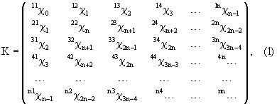 После этого на основе полученных выборок (x0, x1, x2,…xr-1)l,i формируют совокупность симметрических матриц {Kl,i}. Матрицу К формируют следующим образом: