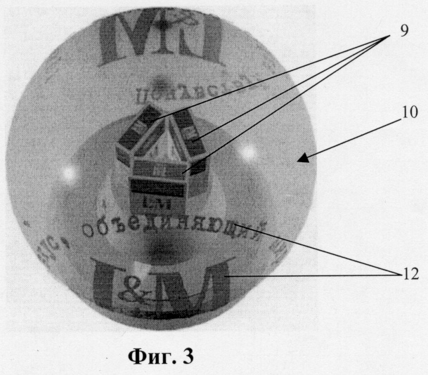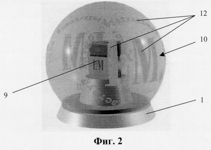 (57) Реферат: Изобретение относится к области рекламного и выставочного дела, а именно к устройствам объемного визуального представления вращающихся объектов рекламы и выставочной информации с подсветкой и с использованием декоративного принципа. Техническим результатом является повышение информативности о рекламируемом объемном объекте, эстетичности и декоративности рекламно-демонстрационного устройства. В рекламно-демонстрационном устройстве, содержащем неподвижный корпус, электродвигатель, подшипник, вращающуюся платформу на которой размещен рекламно-демонстрационный объект, и внешнюю прозрачную оболочку, охватывающую рекламно-демонстрационный объект, в качестве подшипника используется подшипник качения с сепаратором, электродвигатель закреплен внутри корпуса по его оси, на валу электродвигателя закреплены внутреннее кольцо подшипника и вращающаяся платформа с рекламно-демонстрационным объектом. Сепаратор подшипника закреплен на корпусе, а на внешнем кольце подшипника закреплена обечайка с опорной поверхностью для внешней прозрачной оболочки. На поверхности прозрачной оболочки могут быть выполнены диффузно отражающие рекламно-информационные знаки, а торец прозрачной оболочки подсвечиваться источниками оптического излучения, например светодиодами. Целесообразно также осуществлять подсветку рекламируемого объекта. 4 з.п. ф-лы, 3 ил. Изобретение относится к области рекламного и выставочного дела, а именно к устройствам объемного визуального представления вращающихся объектов рекламы и выставочной информации с подсветкой и с использованием декоративного принципа. Известны различные технические решения, которые решают задачу визуальной демонстрации объектов рекламного и информационного характера. Например, известно демонстрационное устройство по А.С. № 1513505, МПК4 G 09 F 11/00, 07.10.89 г., в котором необходимая информация с ленты, перемещаемой приводом с одного валика на другой, демонстрируется посредством управляемого освещения. Известно также устройство для визуального представления информации по Авт.св. СССР № 1596374, МПК4 G 09 F 11/00, 30.09.90 г., содержащее информационные барабаны разного диаметра, установленные концентрично друг относительно друга, снабженные автономными приводами. Во всех барабанах выполнены продольные прорези, а на наружной поверхности внутренних барабанов размещены лампочки подсветки. Данные устройства не позволяют осуществить рекламную демонстрацию объекта в объеме и, кроме того, данные устройства потребляют много электроэнергии и имеют низкую информационность и эстетичность. Известно устройство для рекламной информации по Авт.св. СССР № 351233, МПК3 G 09 F 11/02, 13.09.72 г., содержащее приводимую во вращение вокруг вертикальной оси колонну, несущую информацию. Над колонной расположены два барабана с возможностью вращения вокруг горизонтальной и вертикальной осей от привода колонны. Данное устройство расширяет объем информации по сравнению с вышеприведенными устройствами, однако и ему присущи вышеописанные недостатки. В качестве ближайшего аналога взято рекламно-демонстрационное устройство по патенту РФ № 2083002, МПК6 G 09 F 11/00, 27.06.97 г., содержащее пустотелый корпус, приспособление для носителя информации, выполненное в виде вертикально расположенного пустотелого валика со съемными т