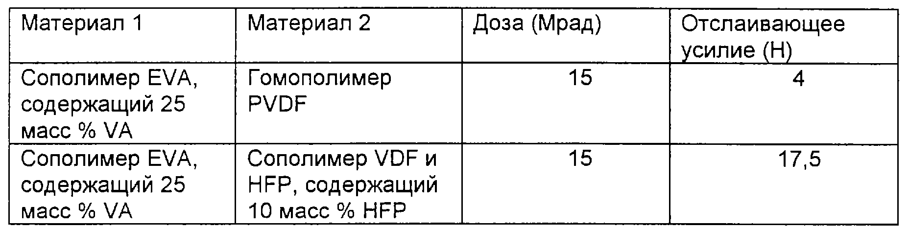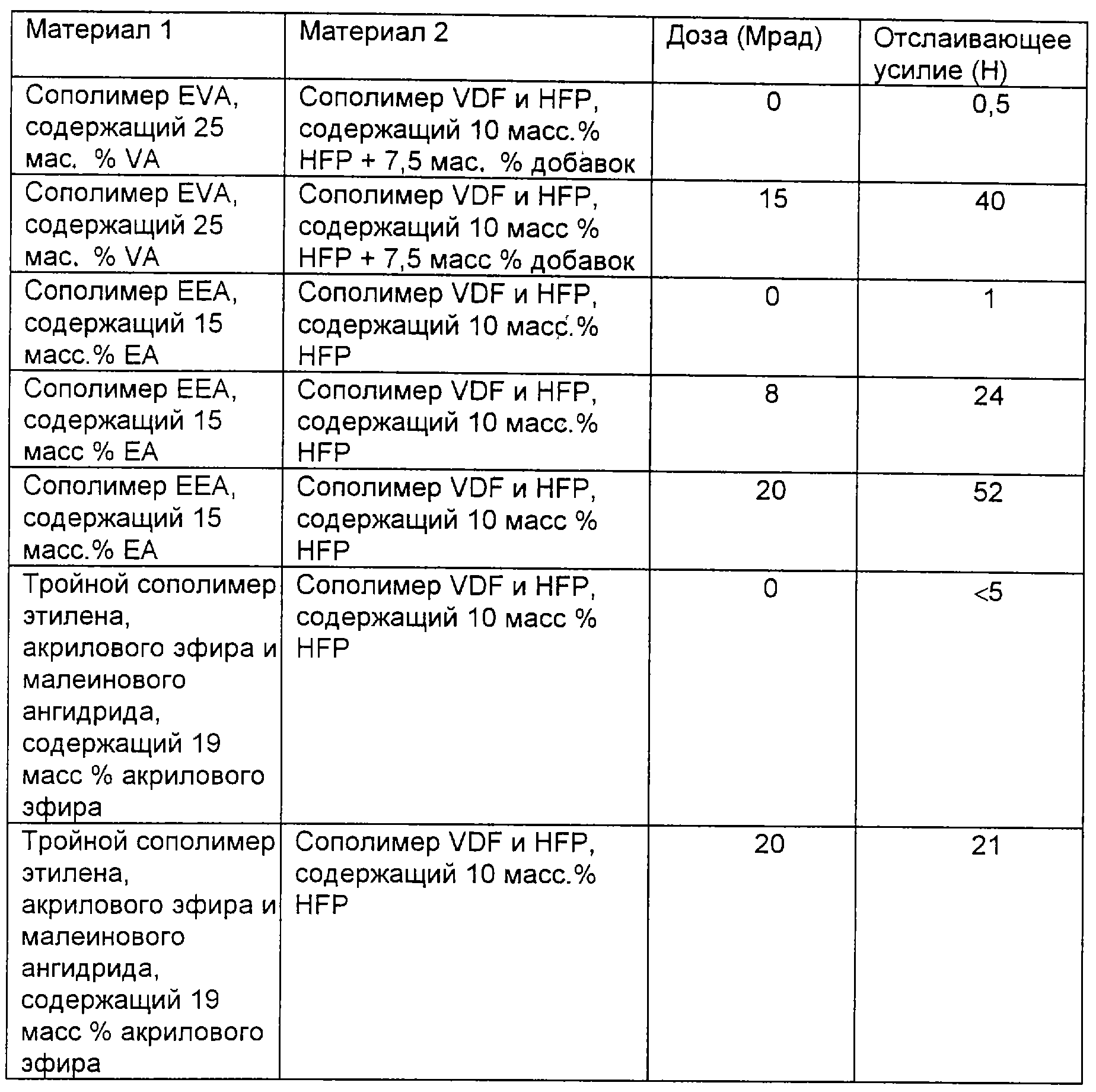 (2) по меньшей мере вторым слоем материала, составляющим по меньшей мере 10 мас.%, предпочтительно – по меньшей мере 50 мас.%, предпочтительнее – по меньшей мере 90 мас.%, а предпочтительнее всего – 100 мас.% второго слоя, поливинилиденфторида (PVDF) или особенно предпочтительно сополимера на основе VDF с частично или полностью фторированным сомономером, предпочтительнее всего сополимера VDF и гексафторпропилена (HFP); в котором указанные слои (1) и (2), находящиеся в контакте друг с другом, были подвергнуты воздействию реакции образования поперечных межмолекулярных связей, предпочтительно посредством облучения, более предпочтительно – ионизирующим излучением, достаточной для увеличения прочности сцепления при отслаивании между указанными слоями до величины, составляющей по меньшей мере 5 Н, предпочтительно увеличивая прочность сцепления по меньшей мере на 50%, предпочтительнее – по меньшей мере на 100%, особенно предпочтительно – по меньшей мере на 500% или 1000% по сравнению с прочностью сцепления при отслаивании слоев без образования поперечных межмолекулярных связей.