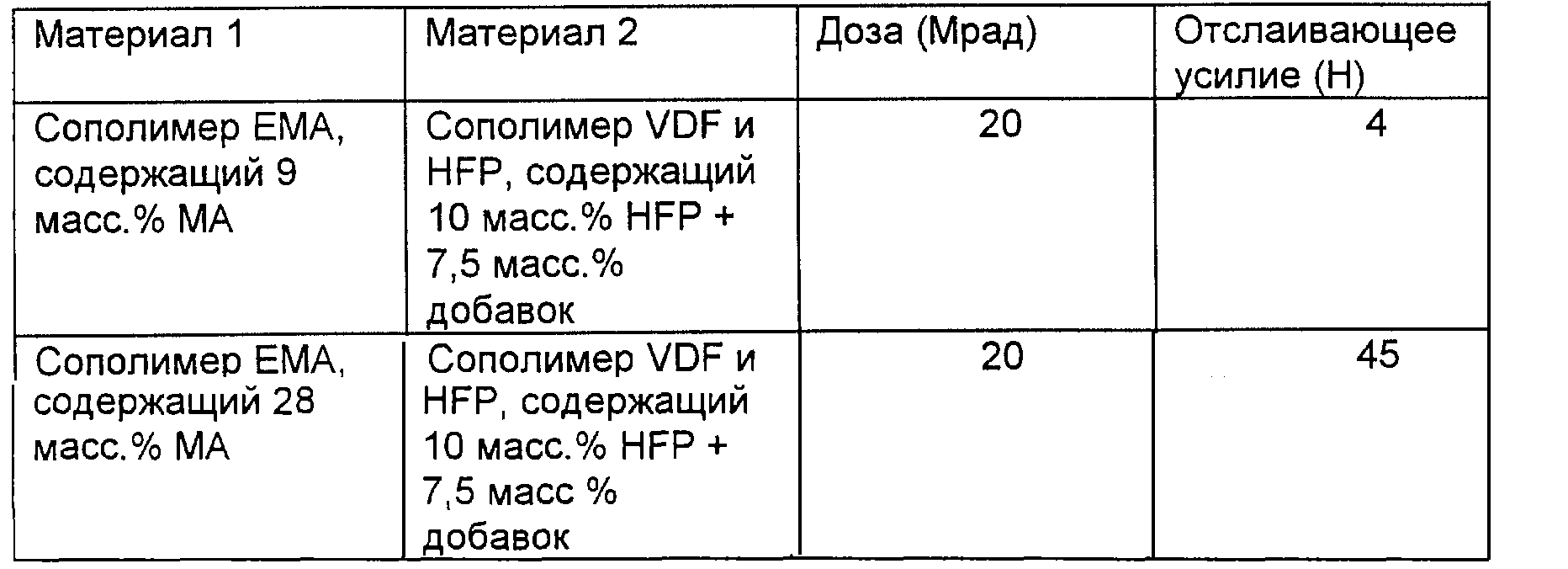 Все результаты, которые приведены в таблицах, были получены в процессе испытаний прессованных пластинок из двух материалов, полученных с помощью стандартных технологий обработки полимеров, известных самих по себе. Пластинки прижимали друг к другу под давлением для сцепления их лицевыми поверхностями и полученный узел облучали, как показано. Пластинки были использованы более для демонстрационных целей, чем для получения изоляции на проводах, вследствие относительной простоты измерения прочности химической связи на пластинках. Ниже приведены условия проведения экспериментов.