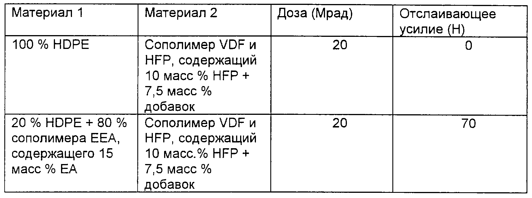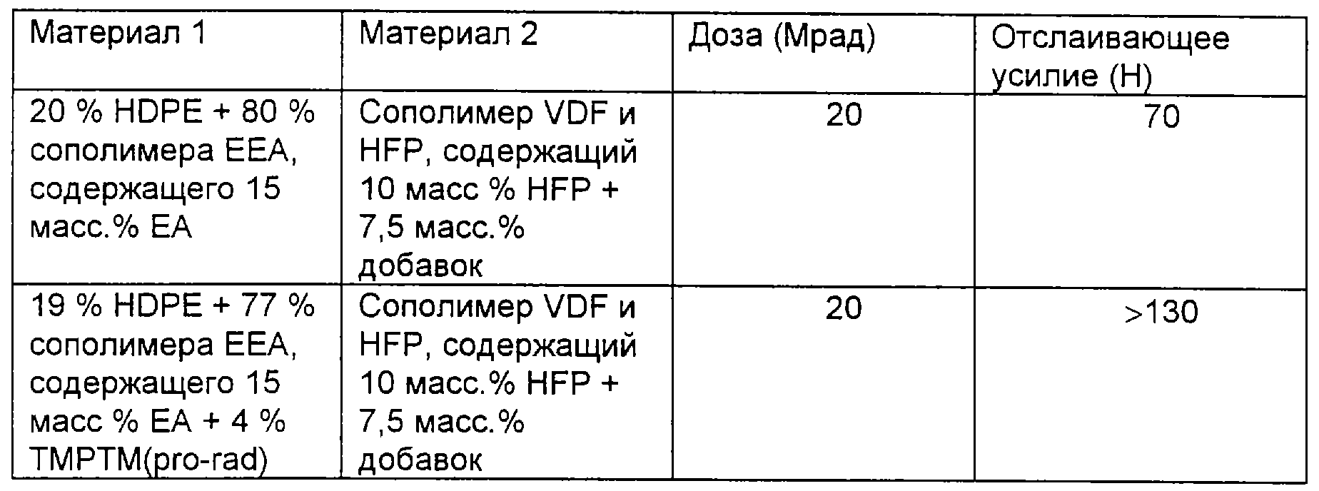 Внешний слой изоляции, состоящий главным образом из сополимера поливинилиденфторида и гексафторпропилена (PVDF/HFP), содержащего 10 мас.% гексафторпропилена (HFP), который в этом примере содержит активатор образования поперечных молекулярных связей и другие известные добавки, например, пигменты, пластификаторы, стабилизаторы, антиоксиданты и ускорители процесса, в обычных пропорциях, составляющие в общем 7,5 мас.%. Этот внешний слой был экструдирован под давлением в отдельной технологической операции на предварительно образованный внутренний слой. Затем этот покрытый продукт был пропущен через электронный луч и получил дозу облучения, составляющую 20 Мрад.