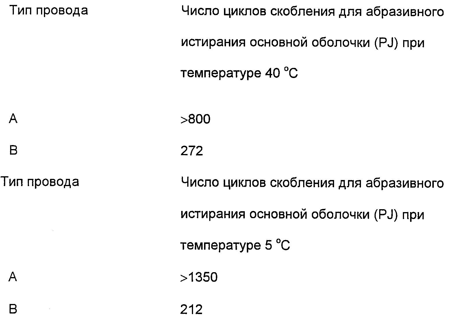Провод (обозначенный как провод А) вышеописанной конструкции, полученный в соответствии с описанным технологическим процессом, сравнивали с проводом (обозначенным как провод В), выпускаемым на промышленной основе и являющимся лидером на рынке проводов, имеющим двухслойную полиолефин/поливинилиденфторидную изоляцию и такие же размеры, что и провод А, в процессе испытаний на выносливость проводов, соответствующих суровым условиям эксплуатации и окружающей среды в процессе применения. В процессе испытаний были получены следующие результаты.
