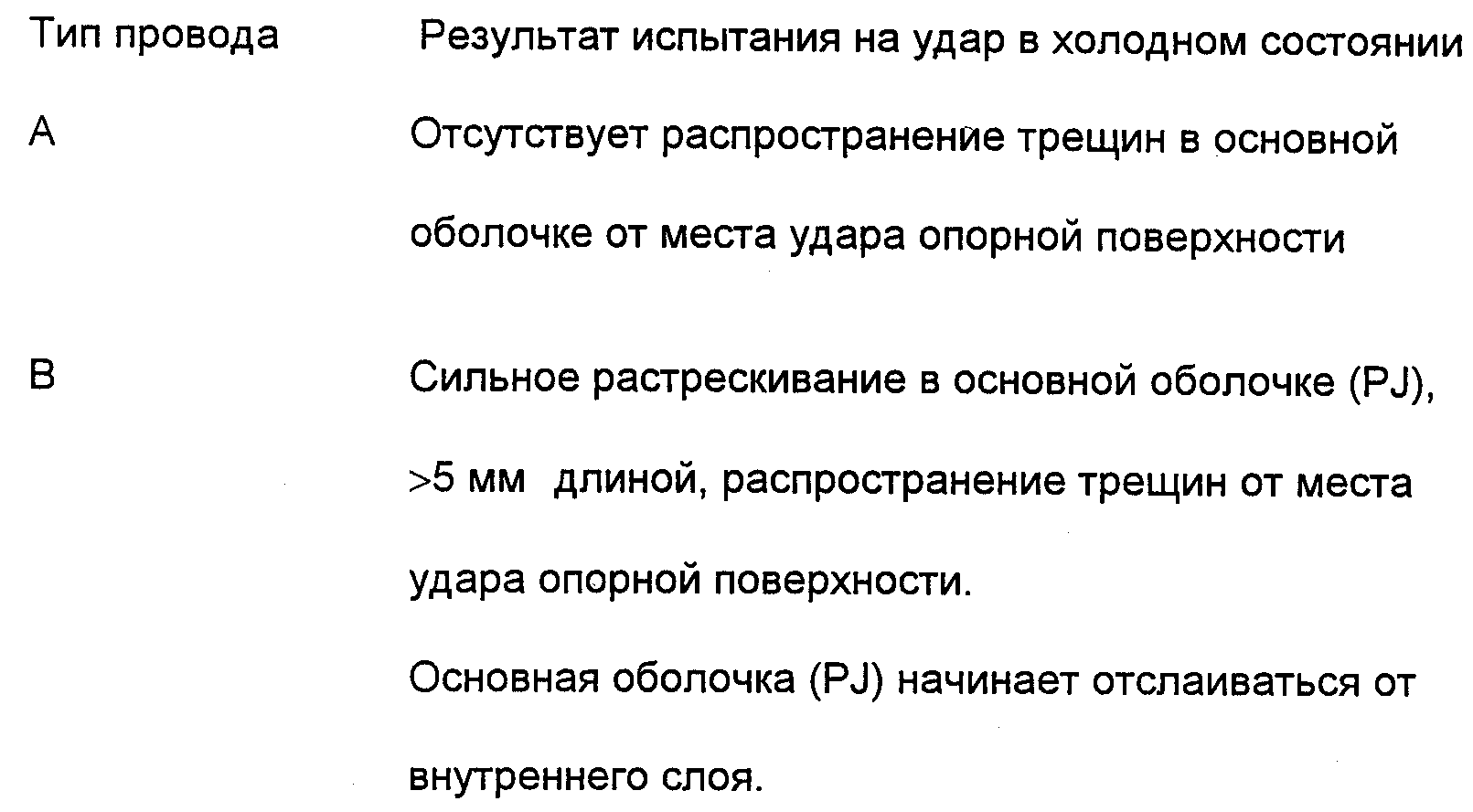 Метод: размер провода – 6 мм2 (площадь поперечного сечения проводника), ударная масса 800 г, высота падения – 275 мм на опорную поверхность, площадь опорной поверхности, ударяющей по проводу, размерами 7 мм 2 мм, расширяющаяся до 3,4 мм под углом 45 с каждой стороны, окружающая температура 5 С. Визуальное выявление распространения растрескивания изоляции.