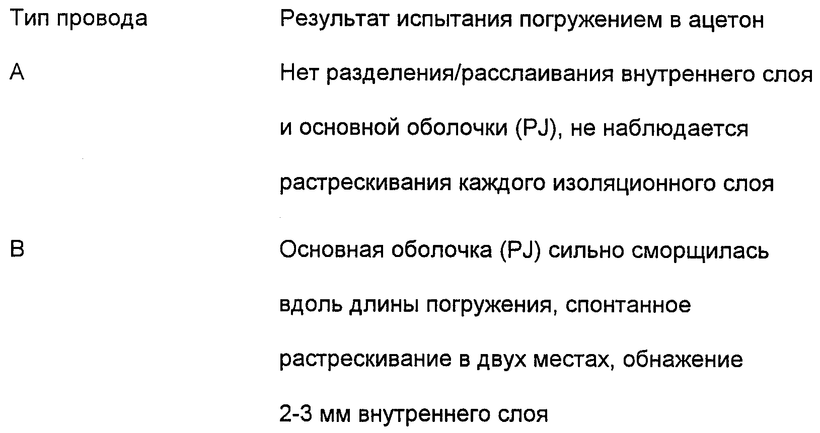 Прочность химической связи, описываемая в этой заявке, может быть измерена как сопротивление отслаиванию между сцепленными полосами двух указанных материалов. Для такого испытания может быть использован стандартный метод, соответствующий ASTM 1876-95. По этому определению значительная химическая связь может быть связью, для которой сила отслаивания превышает 5 Н, а прочная химическая связь может быть связью, для которой сила отслаивания превышает 10 Н. Удобный способ измерения прочности химической связи между указанными слоями (1) и (2), когда они сформированы на проводе, является размещение образцового провода общей длиной 60 мм в ацетоне (например, в ацетоне сертифицированной частоты в соответствии с Fisher Scientific UK, AR) на глубину ацетона, эквивалентную 70% длины образцового провода, при температуре 23(±3) С на время, равное одному часу. Провода с незначительным сцеплением изоляционных слоев испытывают удлинение основной PVDF оболочки вдоль оси провода, то есть независимо от какого-либо удлинения полиолефинового внутреннего слоя, и/или сморщивание основной оболочки так, что она отслаивается от внутреннего слоя в некоторых местах. Если это имеет место, то вышеупомянутое удлинение основной оболочки, как правило, приводит в результате к образованию “трубки” основной оболочки, проходящей на 1 мм или более за конец среза внутреннего слоя в образцовом проводе, следуя вышеуказанному испытанию. Провода со слоями изоляции, имеющими значительную химическую связь, испытывают совместное удлинение внутреннего слоя и основной оболочки без разделения за края среза проводника вдоль оси провода и/или совместное сморщивание внутреннего слоя и оболочки, без расслаивания. Какое-либо такое совместное сморщивание внутреннего слоя и основной оболочки может быть отлично от сморщивания основной оболочки только при исследовании поперечного сечения складок под микроскопом.