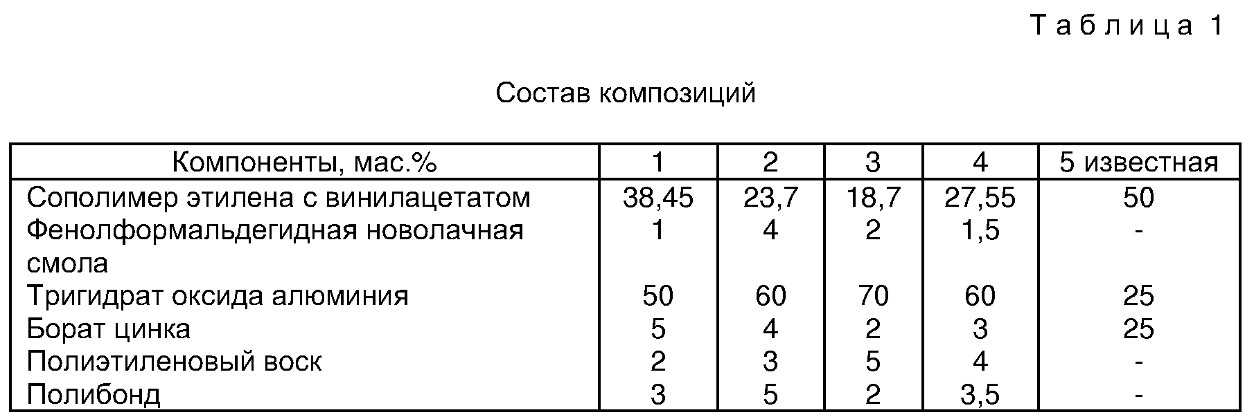 Формула изобретения Электроизоляционная композиция, содержащая сополимер этилена с винилацетатом, тригидрат оксида алюминия, борат цинка, отличающаяся тем, что она дополнительно содержит новолачную фенолформальдегидную смолу, полиэтиленовый воск или полиэтиленовый воск, модифицированный винилацетатом, полиэтилен высокой плотности, модифицированный малеиновым ангидридом – Полибонд 3009, 1,3,5-триметил-2,4,6-трис(3,5-ди-трет-бутил-4-гидроксибензил)бензол – Ирганокс 1330 и бензолпропионовой кислоты, 3,5-бис(1,1-диметилэтил)-4-гидрокси-,2-[3-[3,5-бис(1,1-диметиэтил)-4-гидроксифенил]-1-оксопропил]гидразид – Ирганокс MD 1024 при следующем соотношении компонентов, мас.%: Тригидрат оксида алюминия 50-70 Фенолформальдегидная новолачная смола 1-4 Борат цинка 2-5 Полиэтиленовый воск или полиэтиленовый воск, модифицированный винилацетатом 2-5 Полиэтилен высокой плотности, Модифицированный малеиновым ангидридом – Полибонд 3009 2-5 1,3,5-Триметил-2,4,6-трис(3,5-ди-трет-бутил-4-гидроксибензил)бензол – Ирганокс 1330 0,05-0,2 бензолпропионовой кислоты, 3,5-бис(1,1-диметилэтил)- 4-гидрокси-, 2-[3-[3,5-бис(1,1 -диметиэтил)- 4-гидроксифенил]-1- оксопропил]гидразид – Ирганокс MD 1024 0,1-0,5 Сополимер этилена с винилацетатом Остальное |